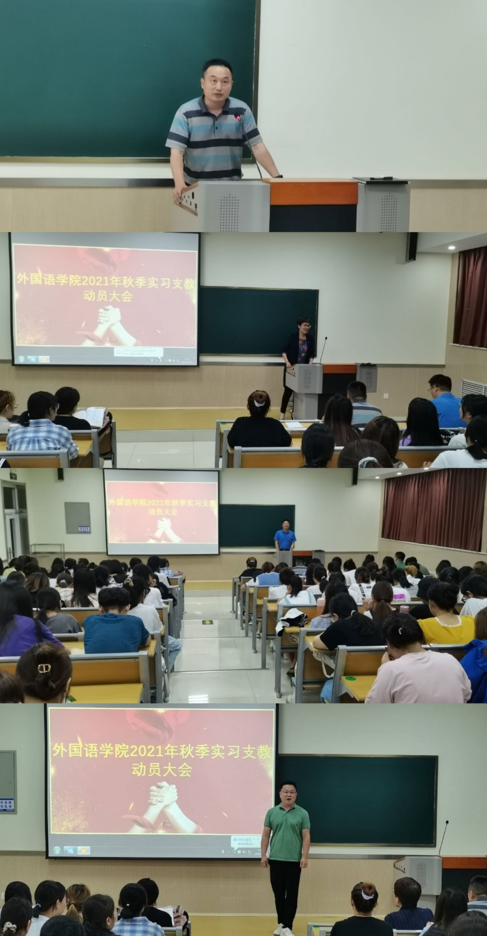 为更好地贯彻山东省师范生实习支教工作精神,落实好我院2021年秋季实习支教工作,6月30日下午,外国语学院在3号楼C101召开2021年秋季实习支教动员大会,该院党委书记陆波、院长杨楠、副院长张殿海、辅导员及即将参加秋季实习支教的2019级英语教育专业的153名学生参加。会议由该院党委副书记许言强主持。