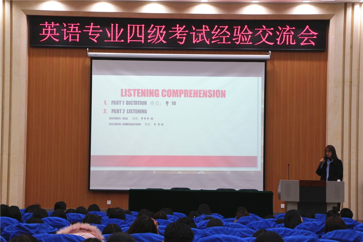 此次经验交流会为同学们的备考提供了正确的学习思路和学习方法,增强了学生备考的积极性和通过专四考试的信心,对营造良好的英语学习氛围和促进学院学风建设具有积极的意义。