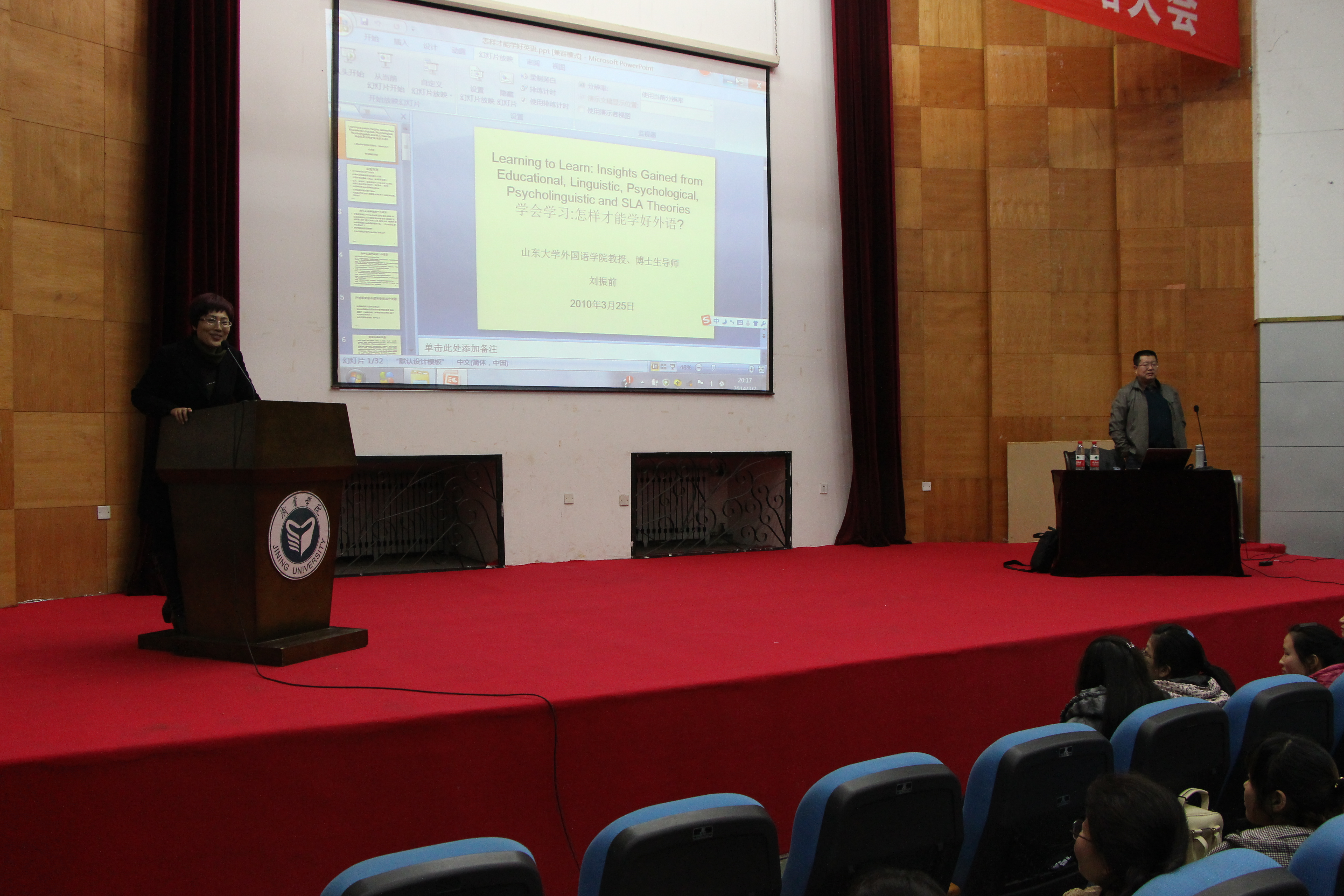 晚上6点半至8点半,刘教授又在我校理科楼报告厅为全系师生做了题为Learning to learn 的学术报告。报告会由外国语系主任杨楠教授主持。刘教授的报告主要分为以下几个方面:学习外语的前景;文学,语言学,翻译三者与外语学习之间的关系以及如何学习文学,语言学及翻译;如何培养听力与口语表达能力;如何提高阅读与写作能力等。刘教授首先从自己学习英语的经历谈起,以语言学、心理语言学和社会语言学的理论框架为基础,深入浅出地讲解了英语学习策略和学习方法。讲座之后,刘教授针对同学们的提问做了耐心而又精彩的回答,针对部分大学生学习中存在的疑惑,刘教授多方位地给出了可行性建议。报告会极大地激发了同学们学好英语的内在动机和追求成为英语人才而不是单纯的英语学习者的愿望,为同学们如何提升综合人文素质如何提高英语水平指明了奋斗的方向。