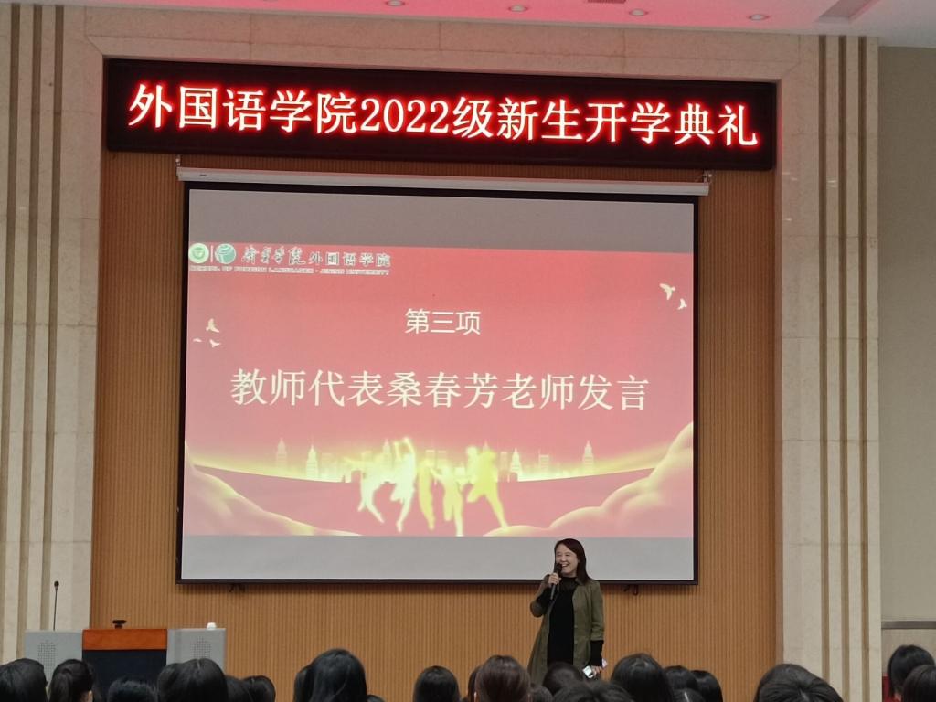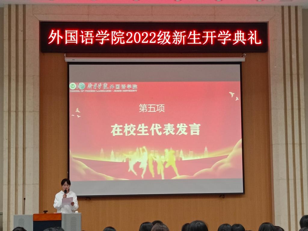 在校生代表李素蕾与同学们分享了自己的学习体会和感想,建议同学们学会用乐观的心态对待生活,在不断成长中驱散迷茫,用知识促就每一次的飞跃,让每一次前行都自信无畏,胸有成竹。新生代表2022级商务英语专业张耘宁同学表达了来到外国语学院的喜悦之情,畅想了对未来大学生活的期待,将好好把握大学生活,用知识武装自己,用青春书写美好未来,做新时代的接班人。