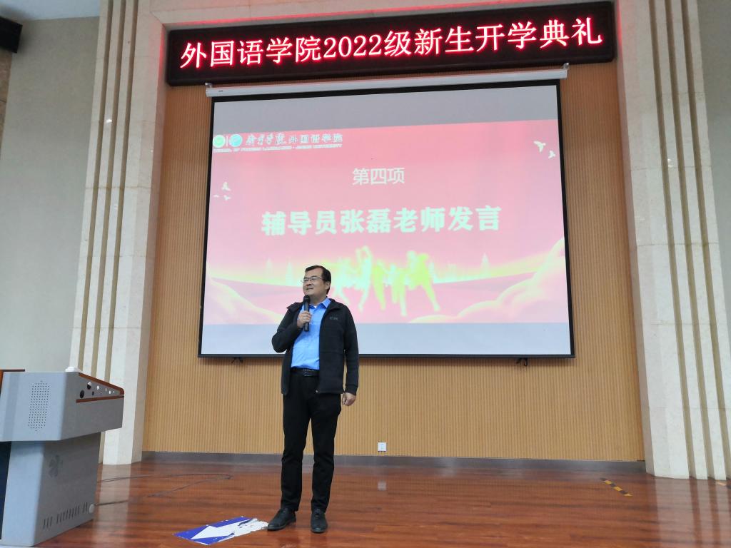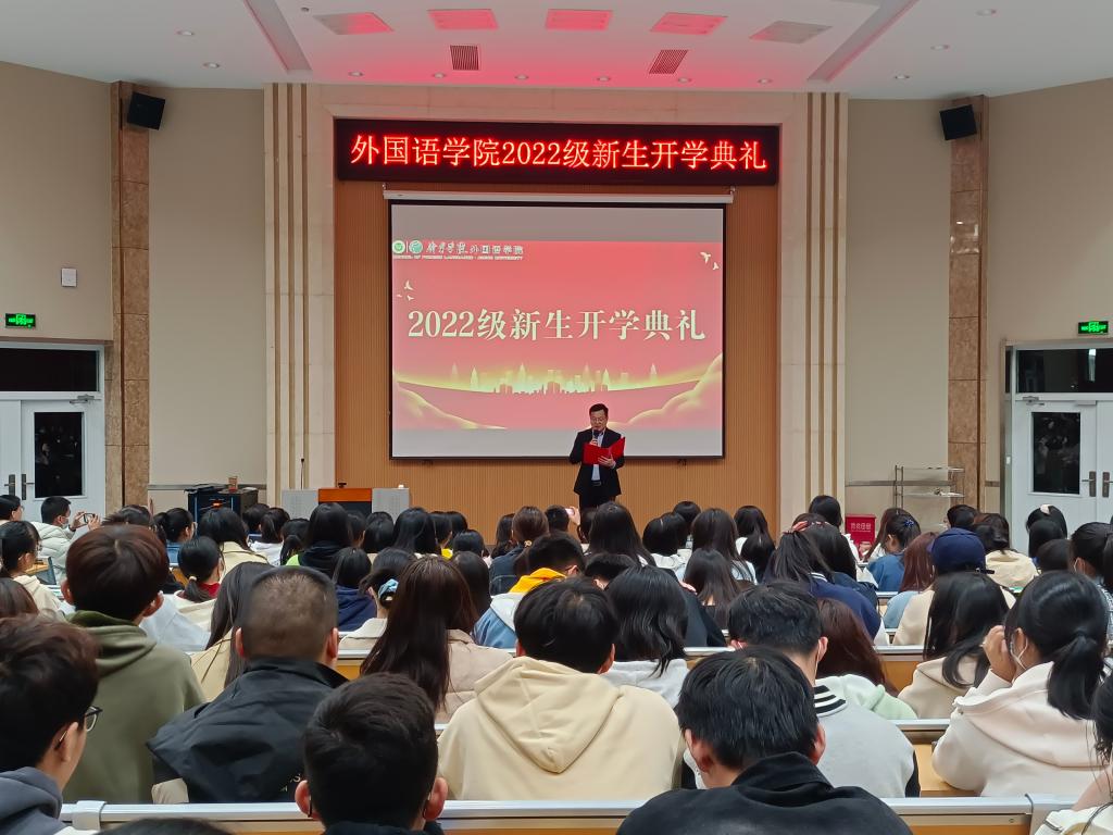 10月9日晚,外国语学院在8号楼报告厅举行2022级新生开学典礼。该院党委书记陆波,院长杨楠,副院长张颖,教师代表、在校生代表、全体辅导员及2022级全体新生参加。开学典礼由该院党委副书记许言强主持。