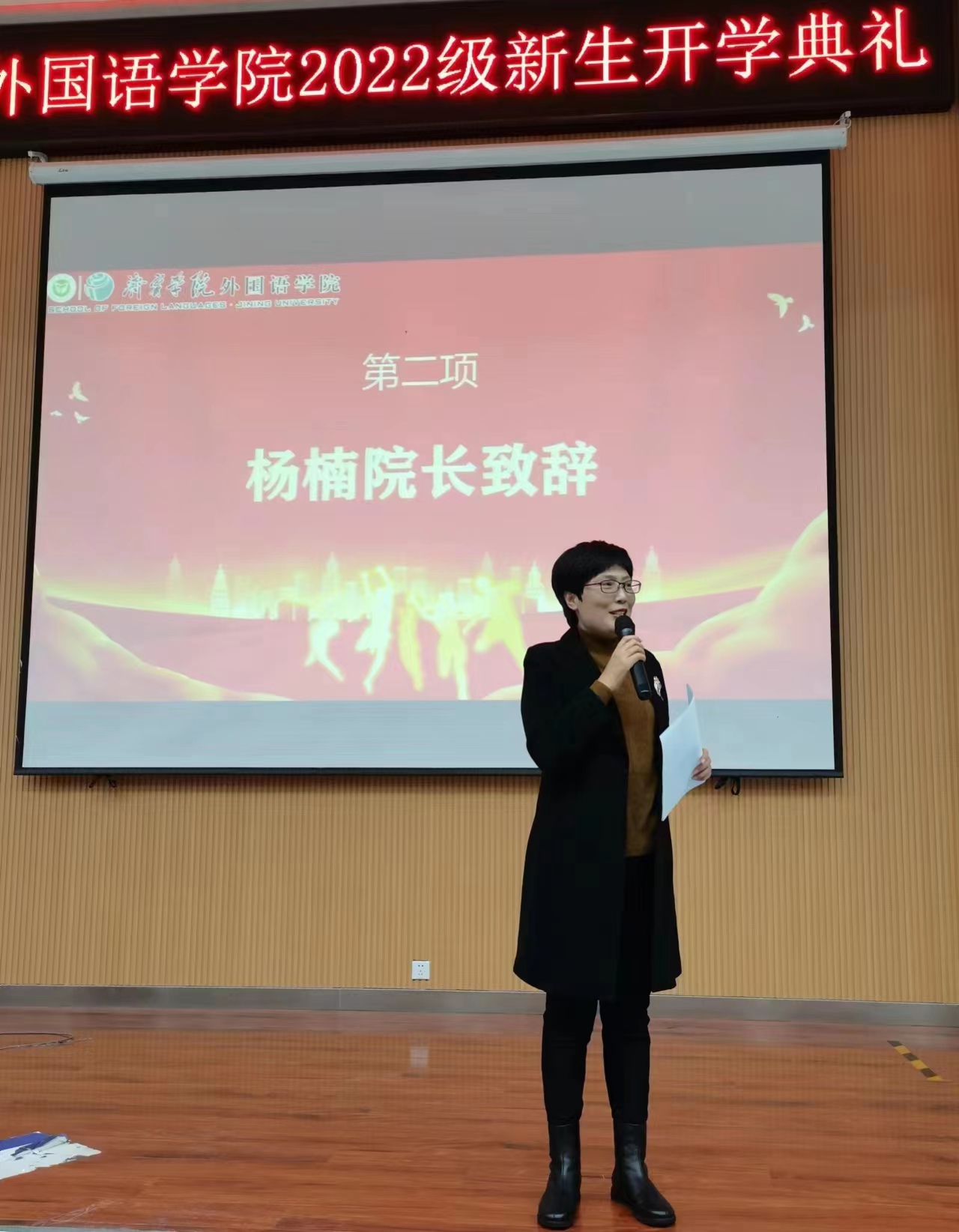 开学典礼在庄严肃穆的奏唱国歌中正式开始。杨楠发表了饱含深情的迎新致辞,代表外国语学院全体师生对2022级617位新同学表示热烈欢迎和诚挚祝贺。她通过大学报到第一天、第一次上专业课、第一次期末考试及第一次去曲阜高铁站四个真实情景再现,讲述了同学A与B两种不同的表现和成长经历,希望同学们成为心中有大爱、大德、大目标之人,做到内心有道,知行合一。杨楠与同学们一起背诵了《礼记·大学》中的“大学之道”开篇,解析了前面四个情景选择题背后蕴含的明明德、亲民、止于至善的大学之道,同时也是格物、致知、诚意、正心、修身、齐家的选择。修身,先从爱自己、爱父母、爱他人、爱劳动、爱社会、爱祖国、爱学习、爱思考开始。鼓励同学们见贤思齐,见不贤而内自省,正视现实,调整心态,做好规划,与书本为伴,读好书,每天积聚能量,努力成为更好的自己。她引用电影《阿甘正传》中阿甘的话“Mama always said life was like a box of chocolates. You never know what you are gonna get”,勉励同学们丰富多彩的大学生活,绝对不只是一盒巧克力的味道,一路奔跑向前,一定能收获幸福的人生。通过大学知识的储备和锻炼不断激发与生俱来的善良和天赋,不断提升自己的胸襟、气度、思想、境界;博览群书,滋养心灵,让心灵的花园四季鲜花盛开,让生命在每个阶段都绽放出独有的光彩。用外语讲好中国故事,承担起外语人“全球视野、家国情怀”的使命,以书为马,开启属于自己的大学之旅,祝愿每位同学都能在大学找到自我,找到内在学习动力,成为手中有书、眼中有爱、心中有家国情怀的新时代大学生。