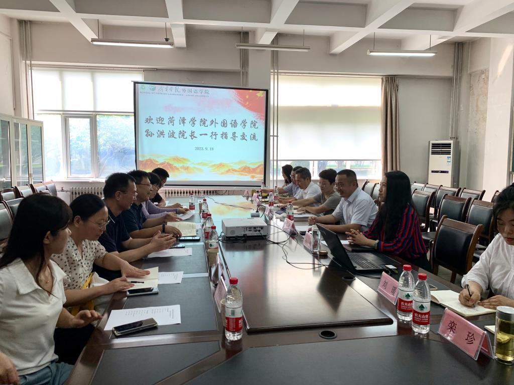9月18日,菏泽学院外国语学院院长孙洪波率领师范专业认证工作组成员来到外国语学院考察交流,就师范专业认证工作进行深入研讨。外国语学院党委书记陆波、副院长张颖、办公室主任闫彩霞、教学科研办公室主任栾珍、院长助理刘暖、专业负责人吴瑞民、专任教师刘春雷、张玉姗等参加座谈交流。