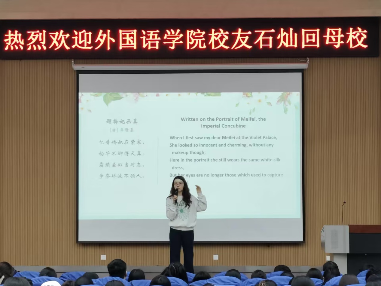 报告会上,石灿结合自身学习经历,以古诗翻译为例讲解了英语专业学生如何高效学习英语。首先,报告以李隆基《题梅妃画真》的原文与译文为引,向同学们讲解了古诗翻译的技巧,并指出翻译学者除了要掌握基本技能以外,还要尽可能地掌握语境知识,从而达到“信、达、雅”。然后,石灿声情并茂地讲述了自己的求学经历,分享了战胜困难的经验和处理人际关系的方法,回顾了老师们的谆谆教诲,浓浓师生情谊溢于言表。