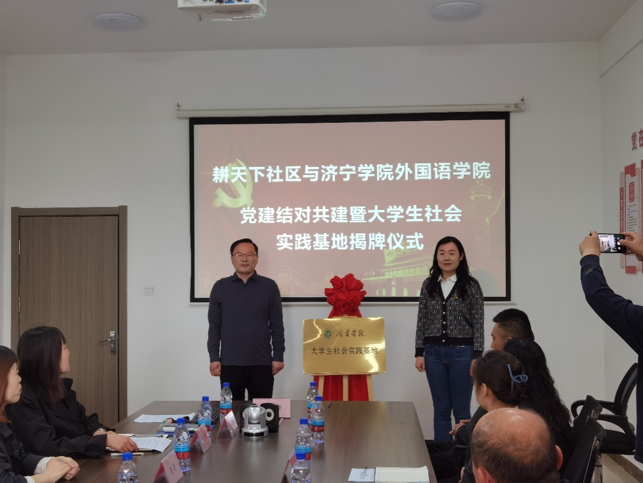 4月8日下午,外国语学院党委与曲阜市时庄街道耕天下社区党委党建共建暨大学生社会实践基地揭牌仪式在耕天下社区党群服务中心举行。外国语学院党委副书记文灿、团委副书记姜璨,曲阜市民政局党组成员、社会综合党委副书记邢洪彬,共青团曲阜市委副书记池雪,时庄街道党工委副书记孔令新,学院辅导员段明月、学生党员代表等参加此次活动。