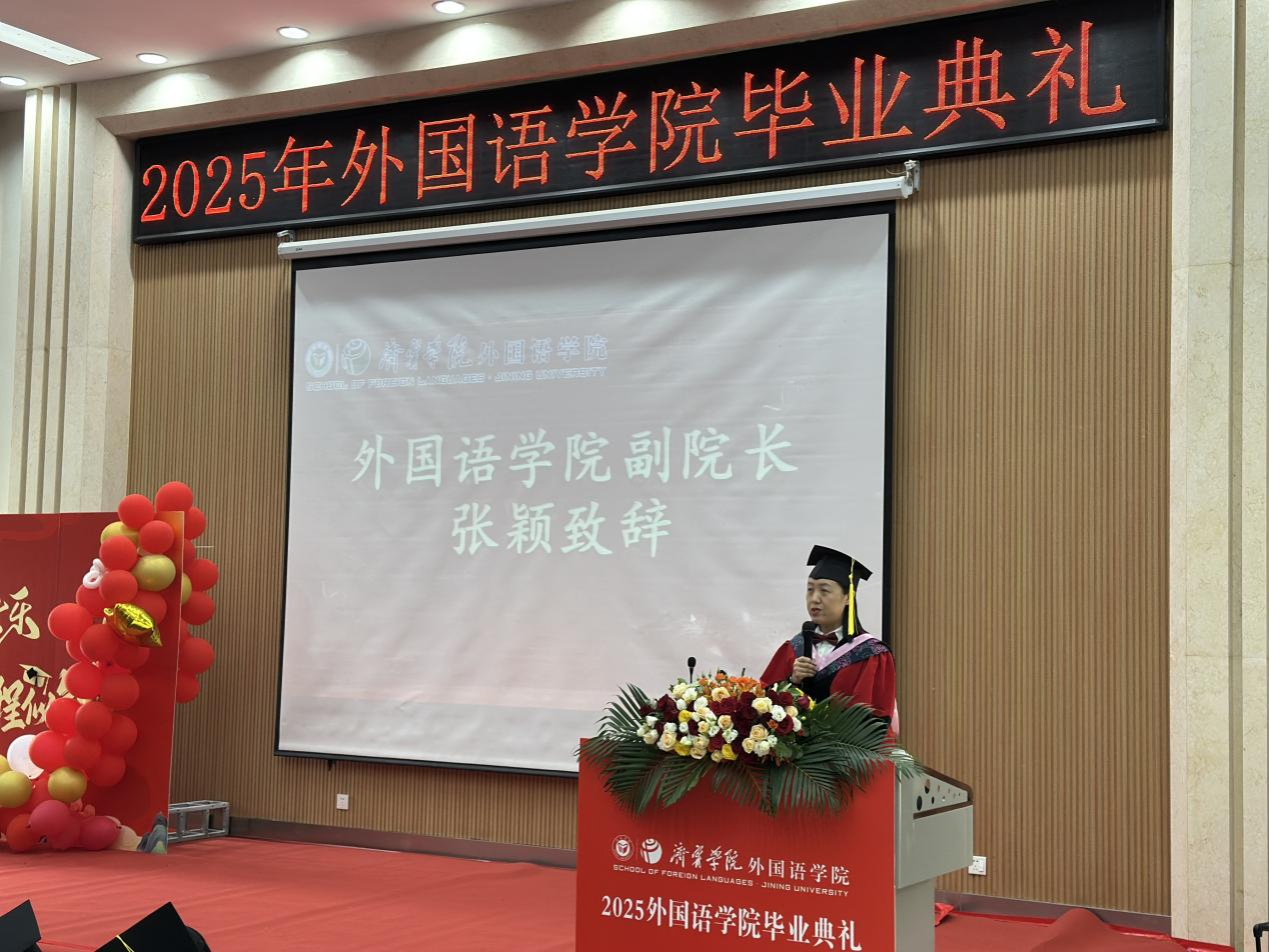 张颖代表学院对全体毕业生顺利完成学业表示热烈祝贺和诚挚祝福。她从“破壁者”、“摆渡人”、“追光者”三个方面回顾了毕业生们四年的“外院故事”,分享了毕业生们取得的优异成绩。她希望同学们做“本土全球化者”、“终身学习者”、“价值守望者”。未来的世界虽充满变数,但语言赋予的底色永不褪色。愿同学们以语言为桥,以文化为帆,奔赴世界的星辰大海。