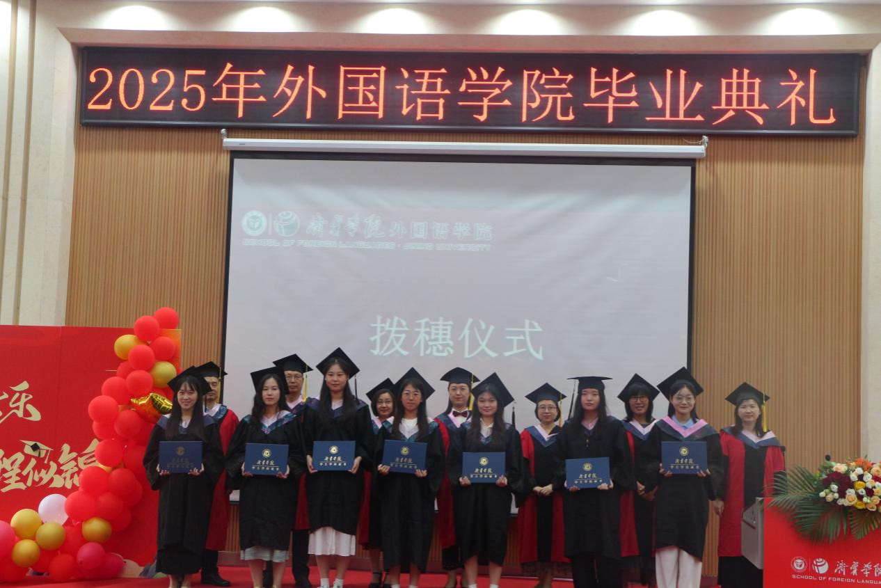毕业典礼上,陆波宣读外国语学院2025届本科学位授予决定、毕业证书颁发决定。教师代表为全体毕业生颁发了毕业证书,为学位获得者拨穗并授予学士学位。同学们依次上台,拨穗、握手、拥抱、合影,浓浓师生情,依依离别意。
