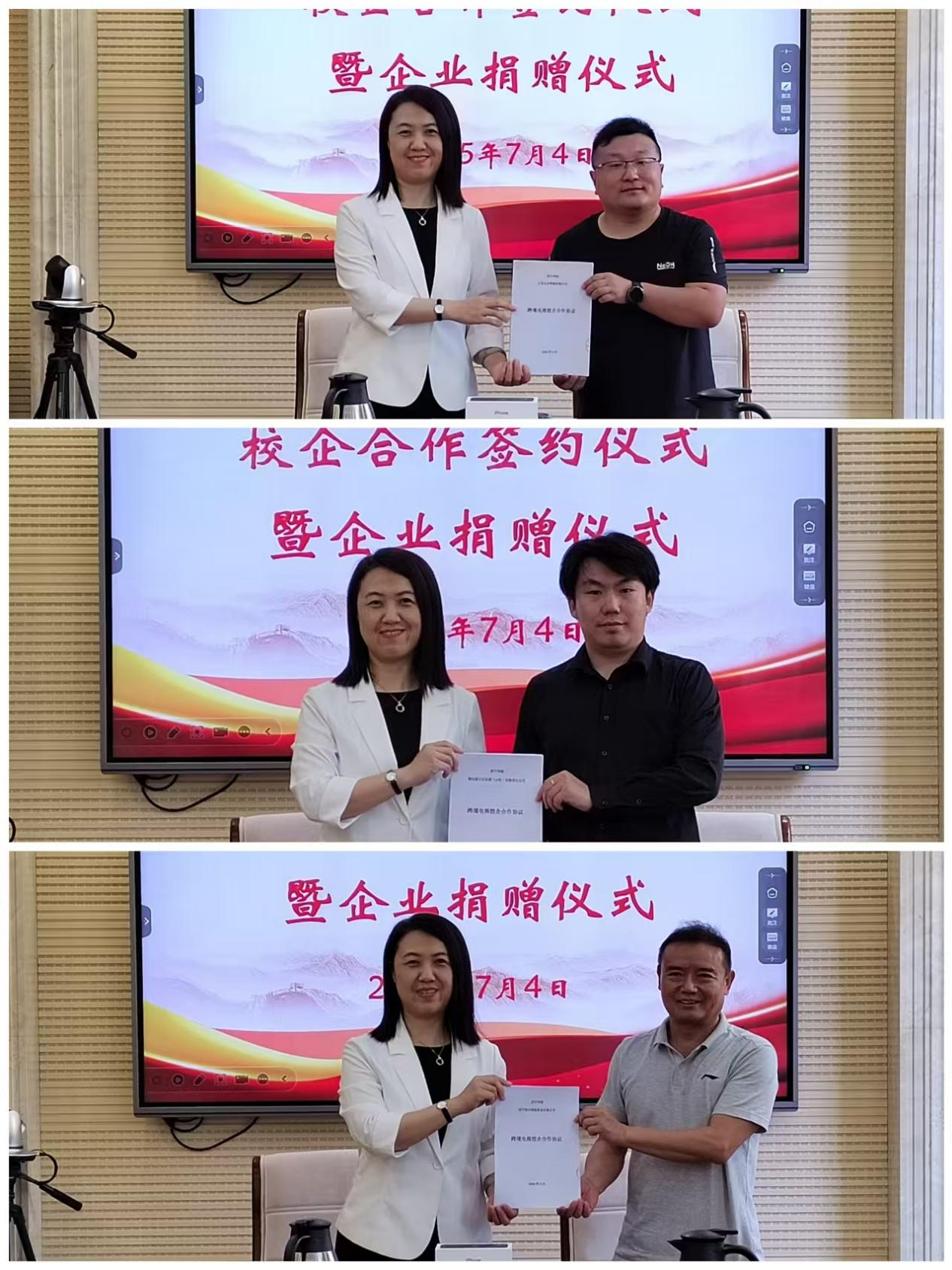 李凡路对三家企业向学校跨境电商实训室捐赠价值数万元的设备表示感谢。他指出,企业捐赠既是校友对母校的关心和支持,也是企业对学校办学质量的高度认可。本次合作将企业实战资源引入课堂,为培养“外语+商务+技术”的复合型人才注入了新动能,希望校企携手在成果转化、人才培养等方面开展更深入的合作,打造“课程共建、师资共培、项目共研”的协同育人新模式。
