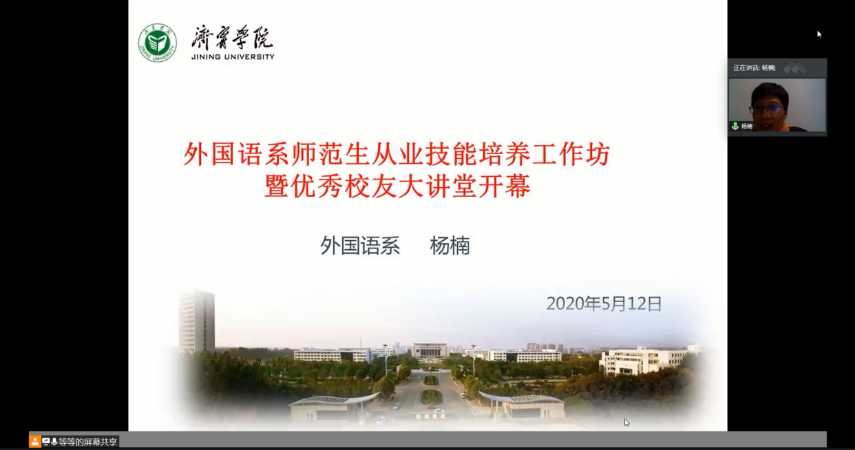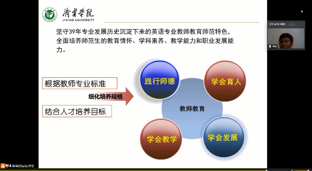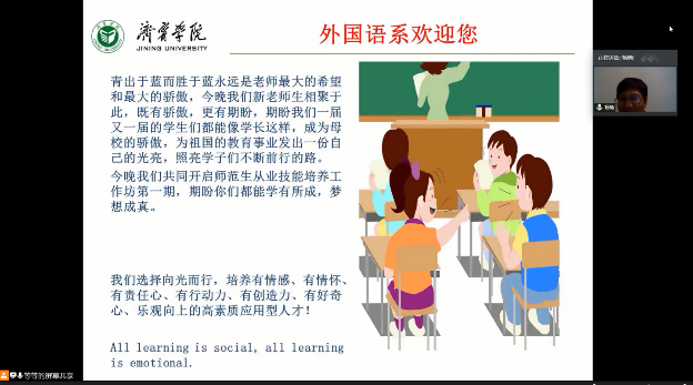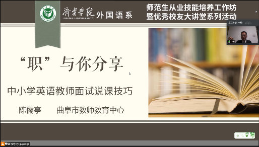 为了全面培养和进一步提升我系师范生的教育情怀、学科素养、教学能力和职业发展能力,5月12日晚6:30-9:00,外国语系通过腾讯会议启动师范生从业技能培养工作坊暨优秀校友大讲堂系列活动。本次工作坊邀请了我系95级校友中学高级教师、济宁杏坛名师、全国优秀班主任陈儒亭老师为我们做了“‘职’与你分享——中小学英语教师面试说课技巧”主题报告。外国语系教师和200多名师范生共同参加了此次活动。工作坊报告会由外国语系副主任张颖主持。杨楠主任致开幕词并总结发言。