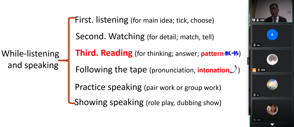 工作坊主讲专家陈儒亭老师从课程标准、核心素养、语音素质、常见课型、教学技能、组织原则和几点提醒等七个方面进行展开,其中主要对常见课型和教学技能进行详细地解析,从阅读课和听说课的课堂环节设计来分享设计方法和处理技巧,并辅以优秀课例说明;对教学技能中的说唱要求进行现场展示,方法灵活,深入浅出,生动精彩。