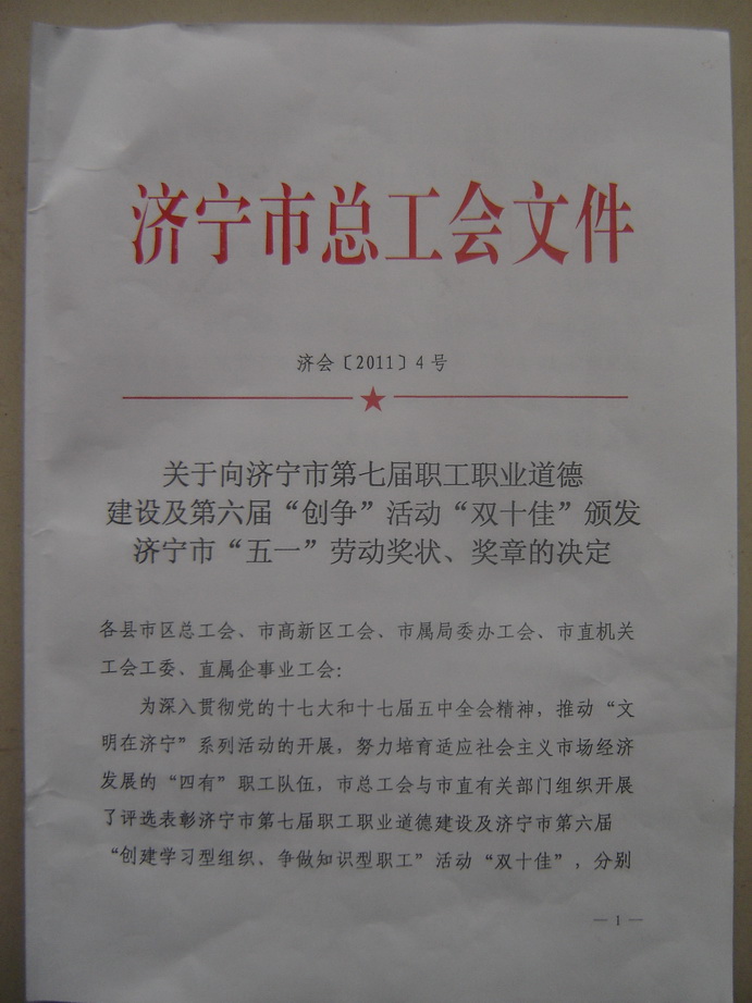 为深入贯彻党的十七大和十七届五中全会精神,努力培养与时俱进、开拓创新的四有职工队伍。济宁市总工会与市直有关部门组织开展了评选表彰济宁市第七届职工职业道德建设及第六届“创建学习型组织争做知识型职工”双十佳的活动。我系在此次“文明在济宁”系列活动的开展中博得众彩,荣获“济宁市第七届职工职业道德建设十佳集体”荣誉称号,并获得济宁市“五一”劳动奖状。