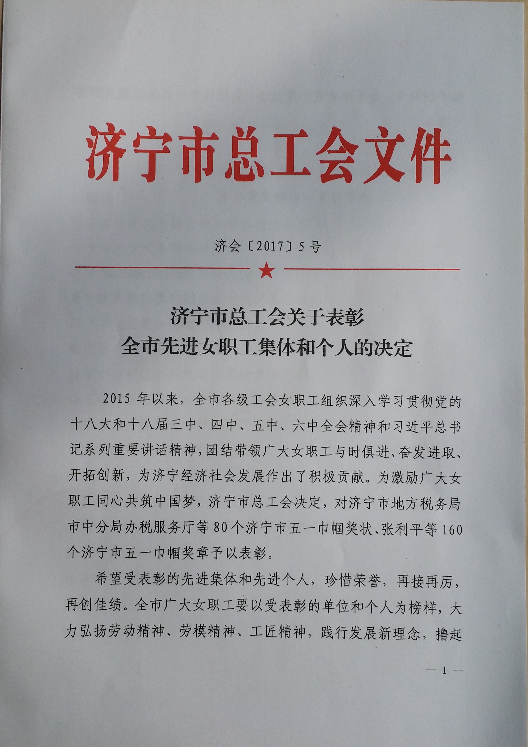 为激励广大女职工同心共筑中国梦,济宁市总工会在2017年“三八节”前夕开展了全市先进女职工集体和个人表彰活动,我系喜获“济宁市五一巾帼奖状”荣誉称号。