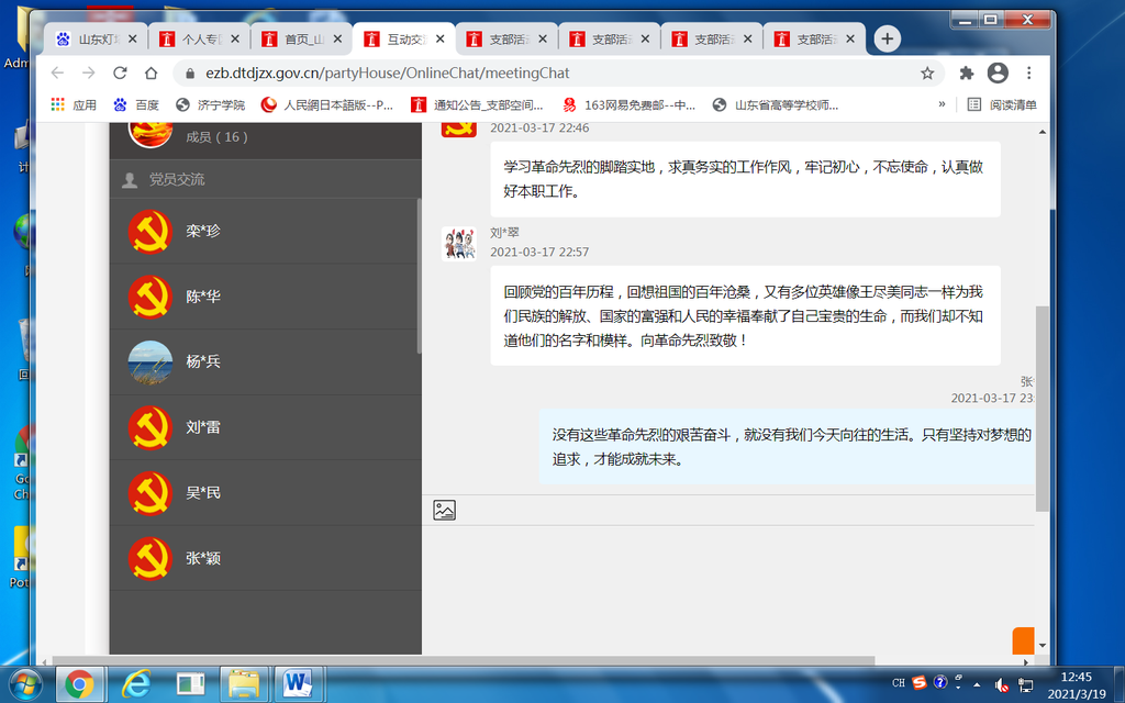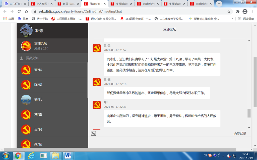 3月17日下午,外国语系教工党支部开展"观看灯塔大课堂第十八课《学习王尽美革命事迹》,线上线下谈收获、谈体会、谈打算"主题党日活动。