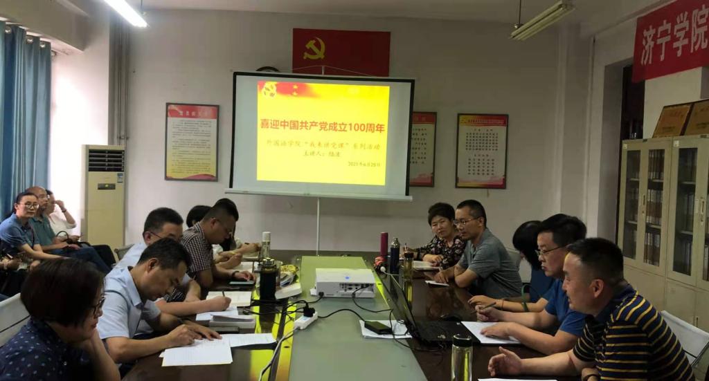 6月25日上午,为庆祝中国共产党成立100周年,更好地推动党史学习教育走深走实,回顾党的光辉历程讴歌党的丰功伟绩,全面强化党组织的战斗堡垒作用和党员先锋模范作用,外国语学院教工党支部在学院会议室顺利开展了“我心永远跟党走”主题党日活动。活动由教工党支部书记吴瑞民主持。