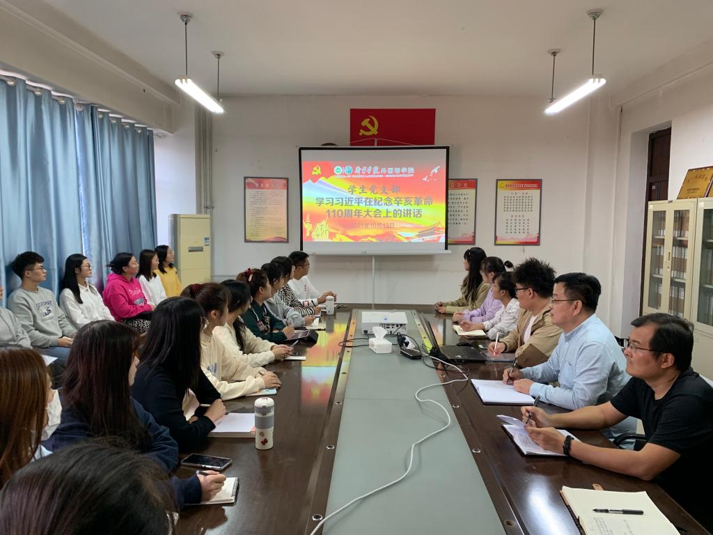 10月13日下午,外国语学院学生党支部在三楼会议室组织学生集中学习习近平总书记在纪念辛亥革命110周年大会上的重要讲话,党委副书记许言强,全体辅导员及学生党员参加。