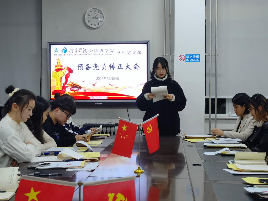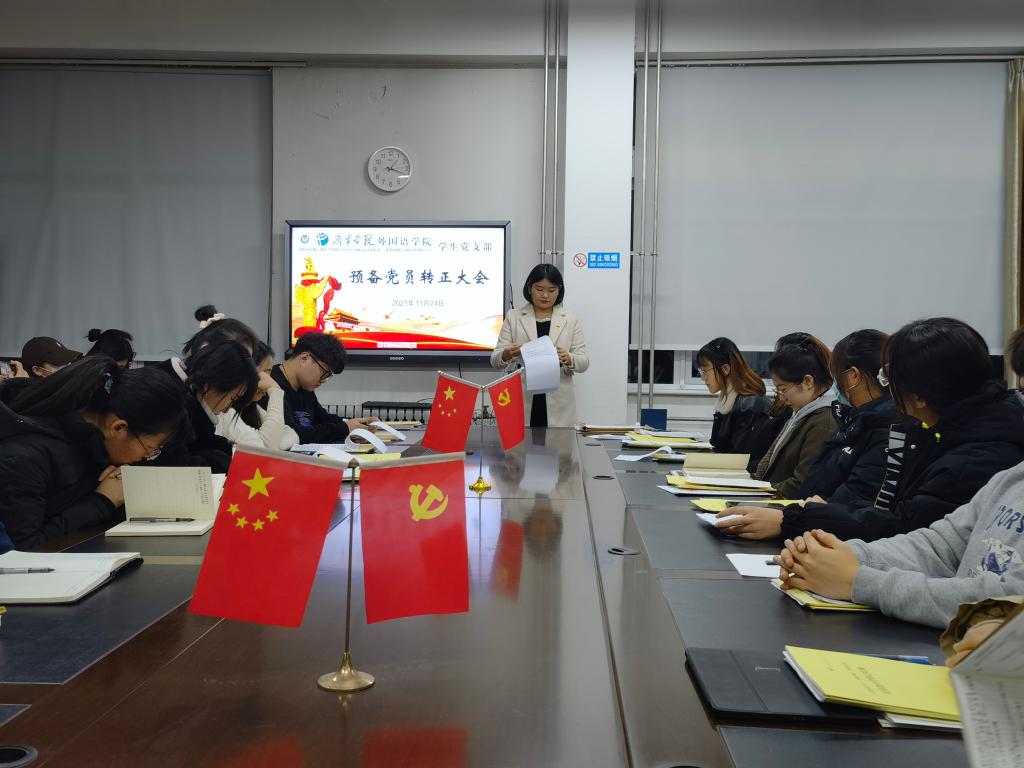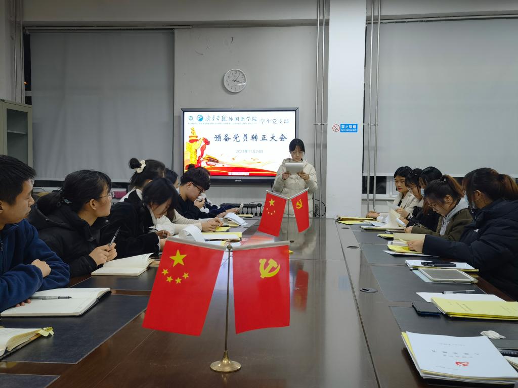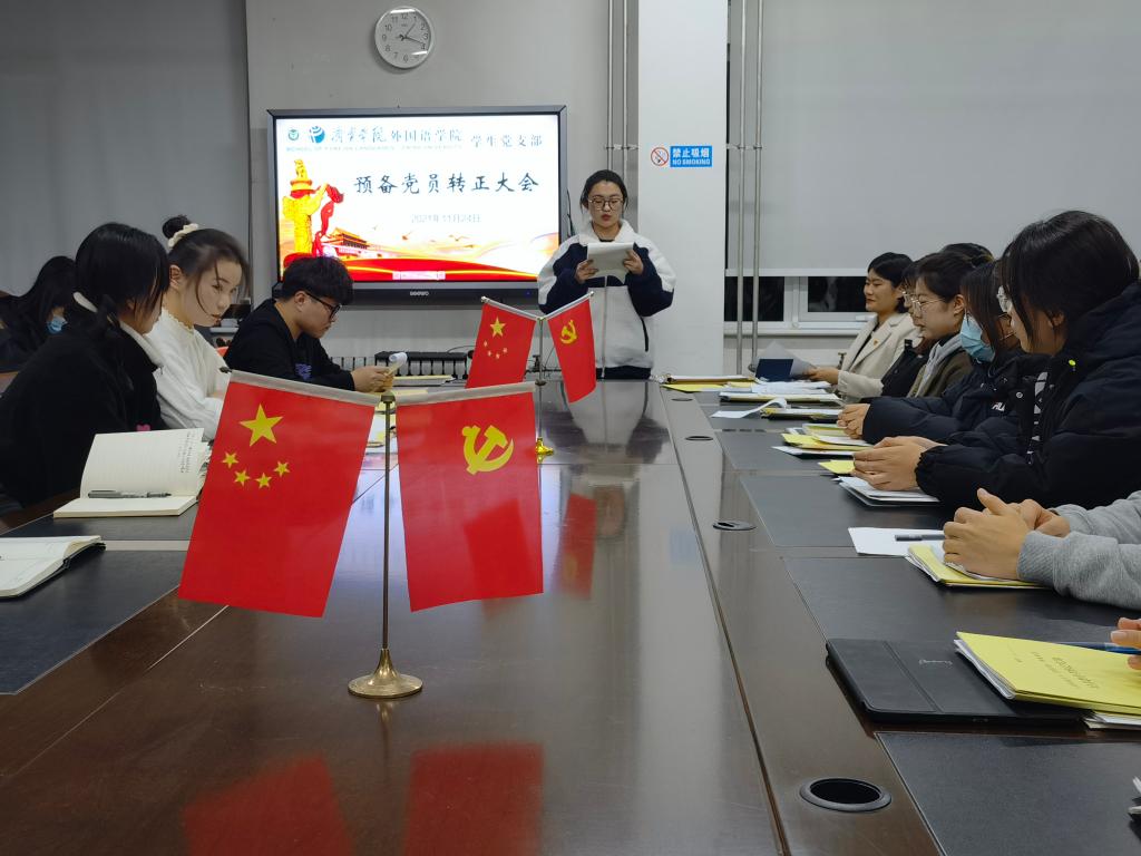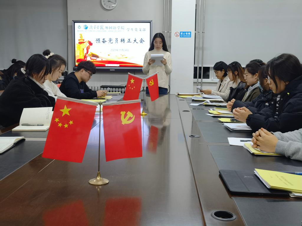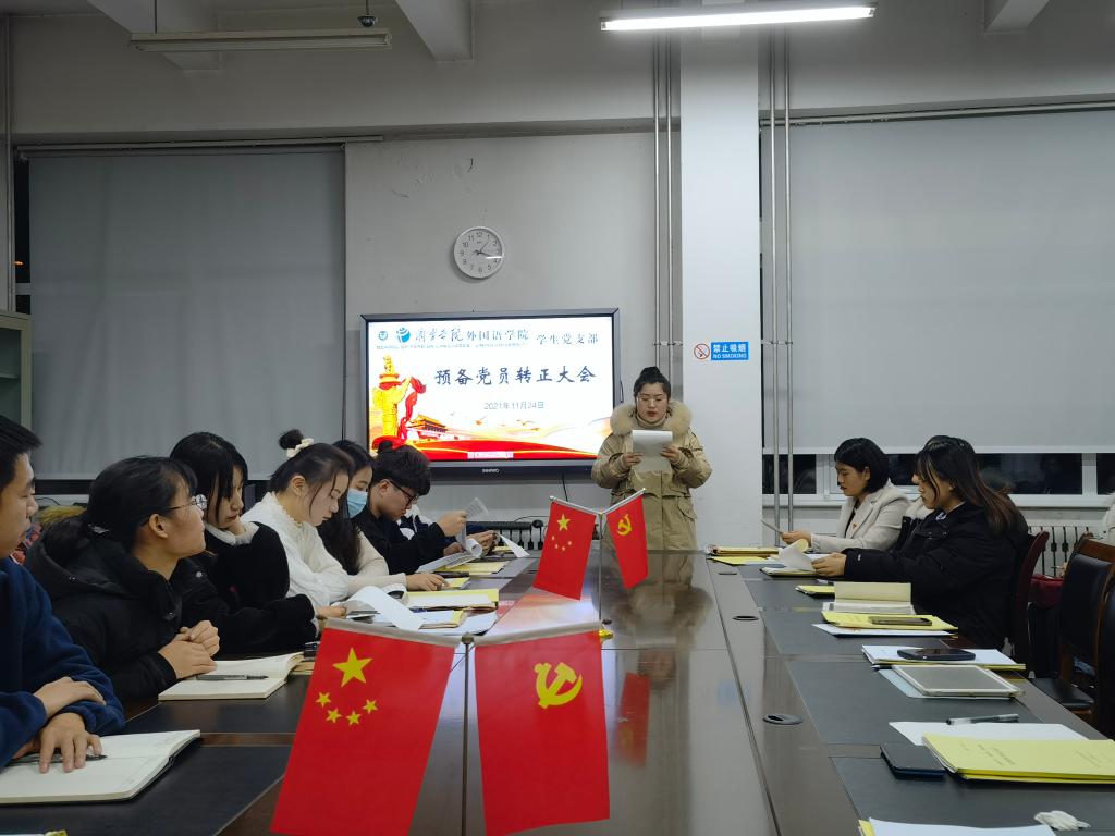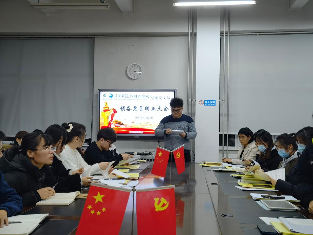 2021年11月24日下午,外国语学院学生党支部于3号楼一楼会议室召开预备党员转正大会。会议由学生党支部书记姜璨主持,外国语学院学生党支部全体党员参加。