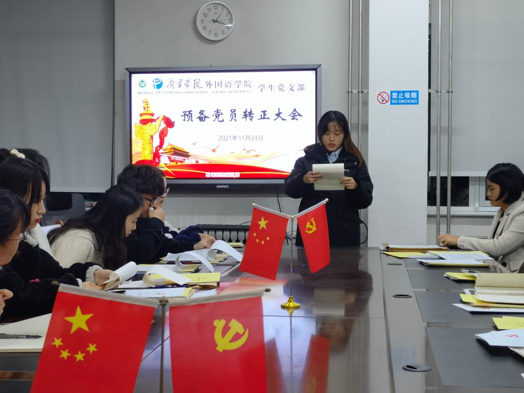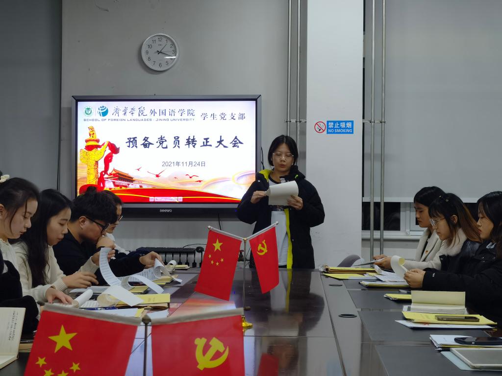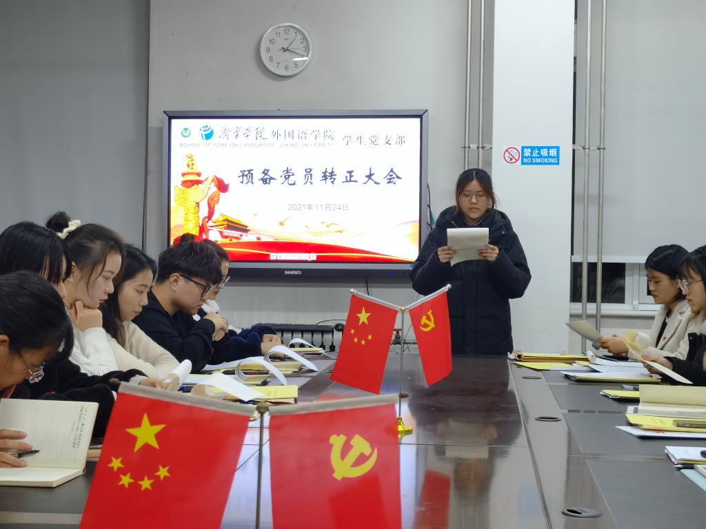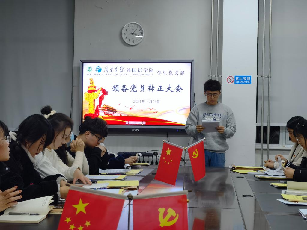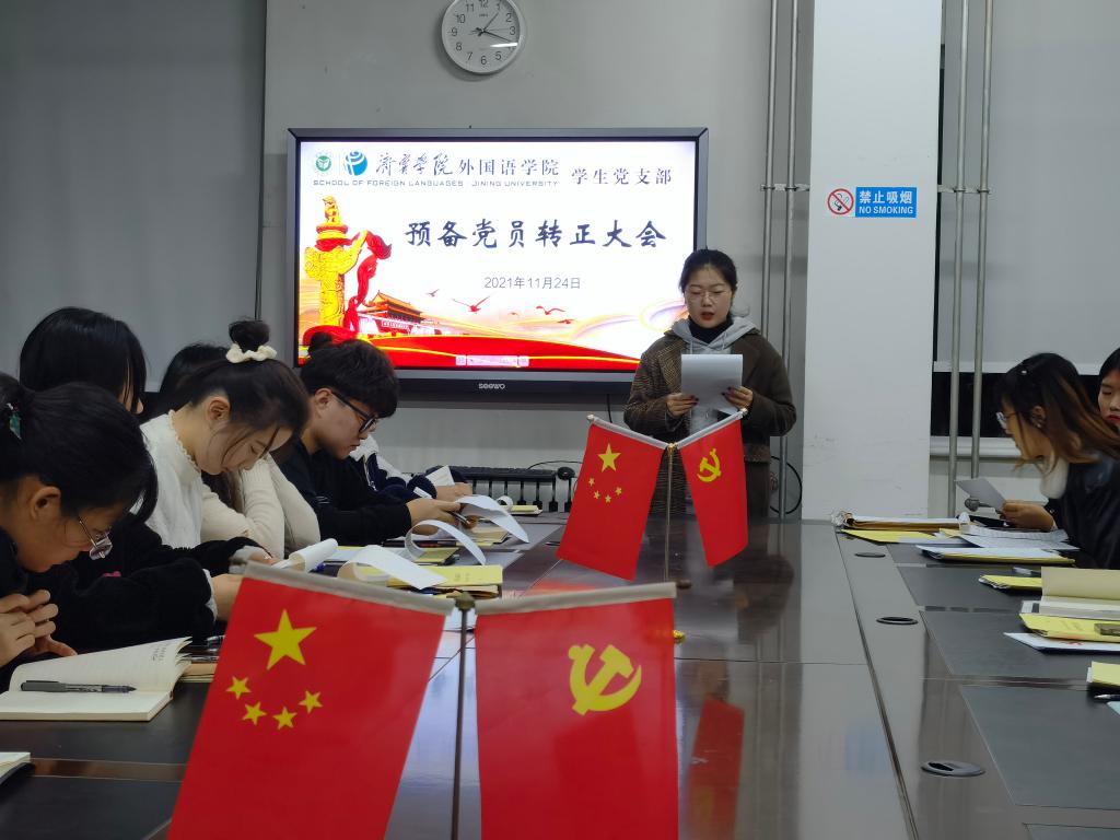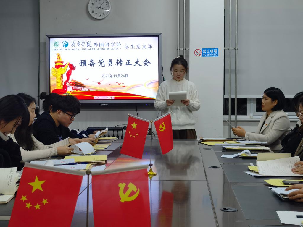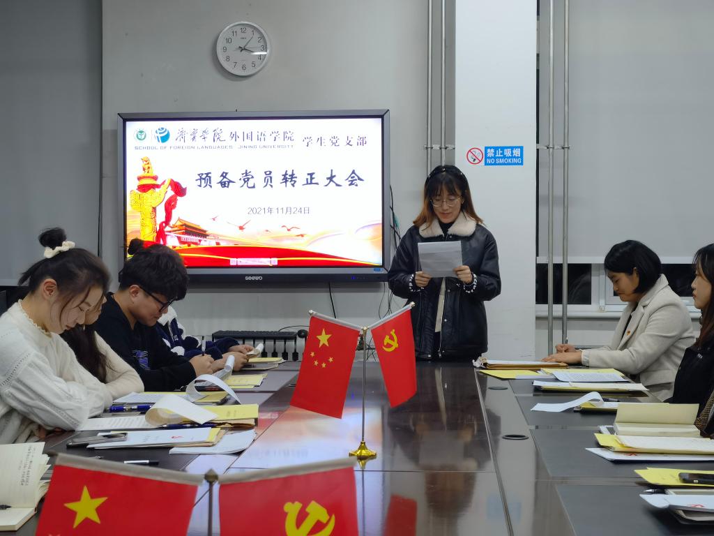 2021年11月24日下午,外国语学院学生党支部于3号楼一楼会议室召开预备党员转正大会。会议由学生党支部书记姜璨主持,外国语学院学生党支部全体党员参加。