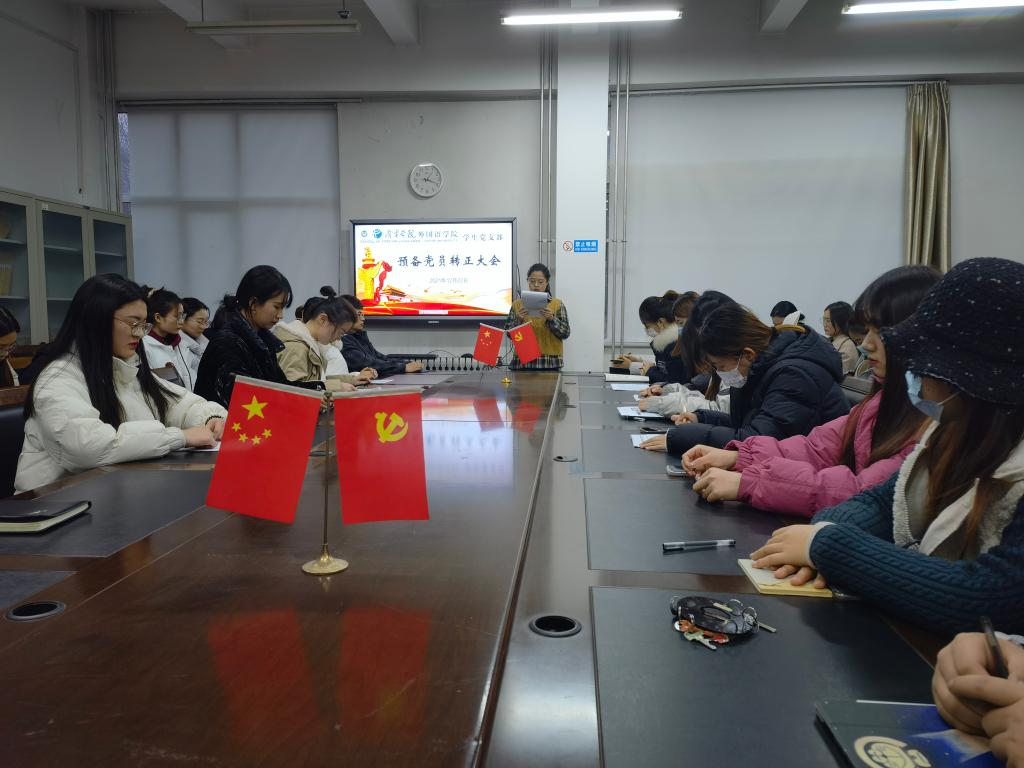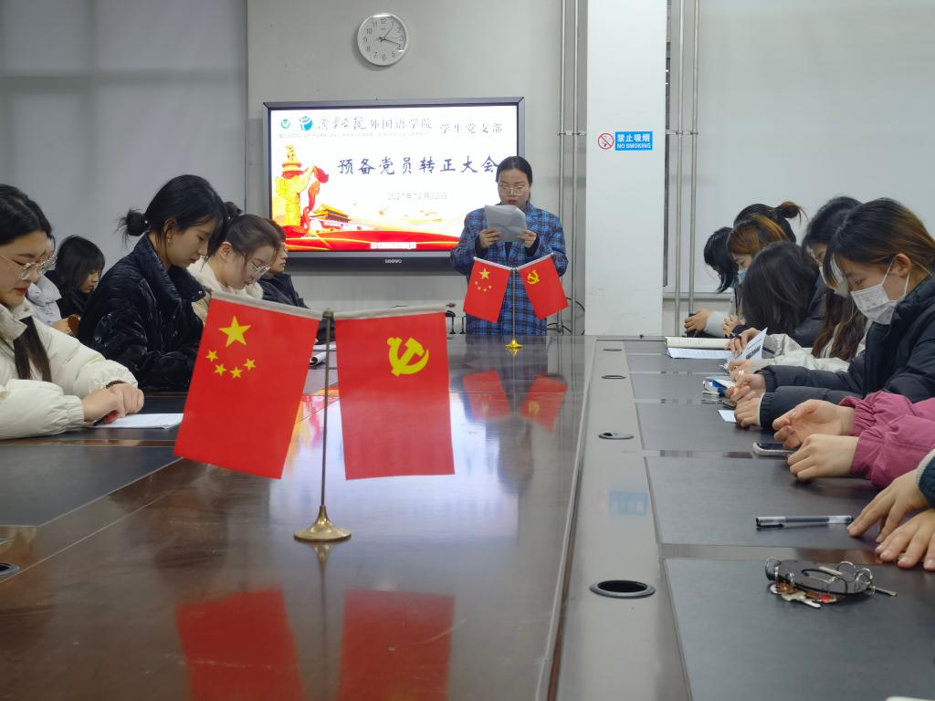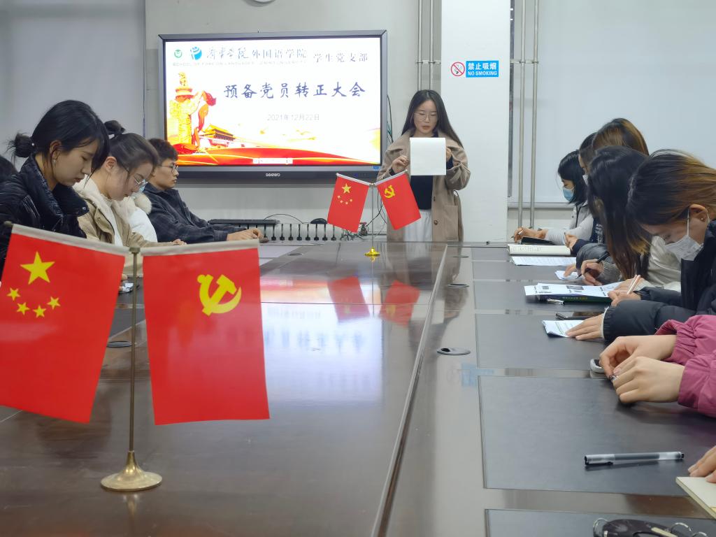 2021年12月22日下午,外国语学院学生党支部于3号楼一楼会议室召开预备党员转正大会。会议由学生党支部书记姜璨主持,外国语学院学生党支部全体党员参加。