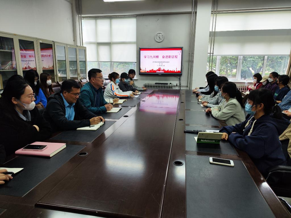 5月11日下午,外国语学院学生党支部在三号楼一楼会议室开展“学习九间棚 奋进新征程”主题党日活动,该院党委副书记许言强,辅导员及学生党支部党员参加。