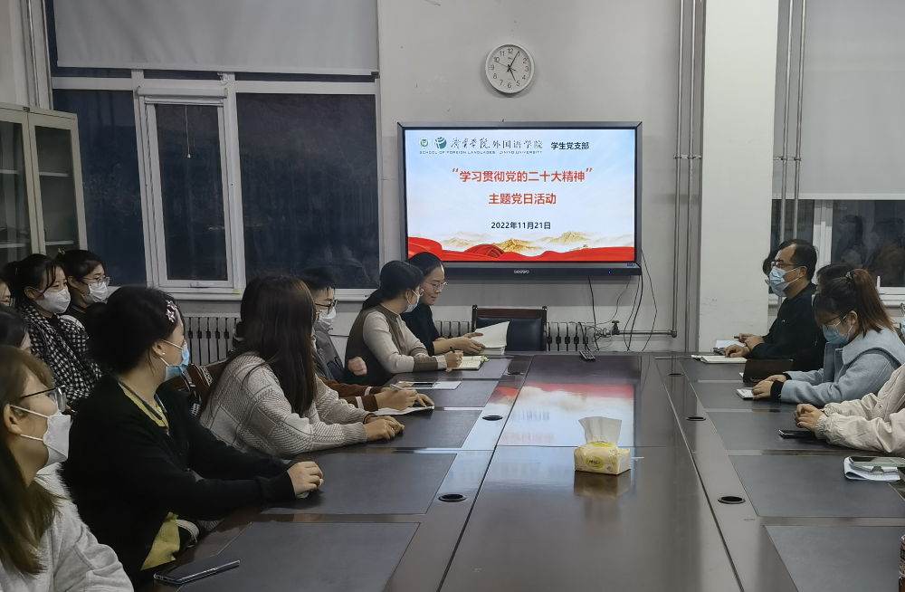 11月21日,外国语学院学生党支部在A110会议室开展“学习贯彻党的二十大精神”主题党日活动,党支部全体党员参加,会议由学生党支部书记姜璨主持。
