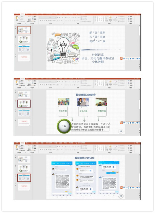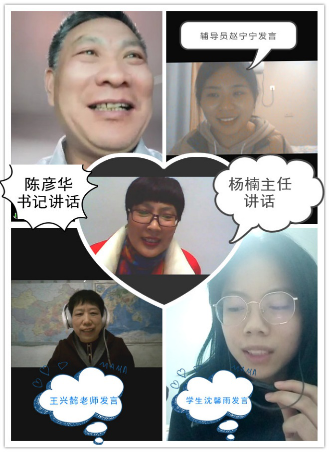 会议开始,师生在云端面对面互致问候和思念,气氛热烈。然后杨楠主任简要传达了学校《2020年度工作会议》精神,提出了我系“教育教学质量提升年”实施方案的目标和规划。党总支书记陈彦华传达了《济宁学院关于做好教职工新冠肺炎疫情防控教育培训的通知》,要求大家认真学习落实到位。接下来每位老师和学生代表都依次积极发言,畅谈了提升线上教学质量、做好课堂思政和返校后教学教育衔接等很多方面的思考和建议。面临这场世界性的疫情,老师们也是使出浑身解数,苦练十八般武艺,学习线上教学软件的使用,思考线上教学模式的改变,这一切都是为了保证线上教学的最佳效果。疫情让所有师生经历了一场美丽的蜕变,老师们分享了各自线上教学的成长与收获:有的老师线上教学一波三折,授课过程就是与网络斗智斗勇的过程,也是老师们一开始线上教学的真实写照。在慢慢的摸索过程中,老师们对线上教学由陌生新鲜到适应熟悉,再到思考探索如何更有效地进行线上教学。有的老师说“主播”历程虽辛苦,但更多的是甜蜜,有的老师用“爱心”“关心”“耐心”感染着学生,有的老师虽感慨无法凝视学生,却也为学生的坚持而感动,有的老师说师生虽然“屏对屏”,但同样可以“心连心”,有的老师坦言经验与挑战并存,思考与进步同在,还有的老师对线上教学进行深入思考,重视学生学习范式的变化,想到了线上线下教学的有效衔接问题,有的老师用“群‘英’荟萃、共 ‘课’时艰、绽放‘云’端”来形容老师们的线上教学真是再恰当不过了……所有的老师通过精心准备的线上教学都收获了一份成就感、获得感、幸福感,都在思考如何提高教学质量,正在探寻更合适的教学模式,都为学生认真的态度、积极的互动,不懈的坚持点赞!辅导员们在做好学生日常思想沟通的同时也思考网络思政工作的方式方法,通过视频会议、致学生的一封信、网上交流等来提高学生的思想认识,大局意识,让学生安心线上学习,确保了线上教学的顺利开展。学生代表发言饱含了对外国语系所有任课老师的感谢感恩之情,他们表示也将继续以饱满的热情上好网课,期待相聚校园!