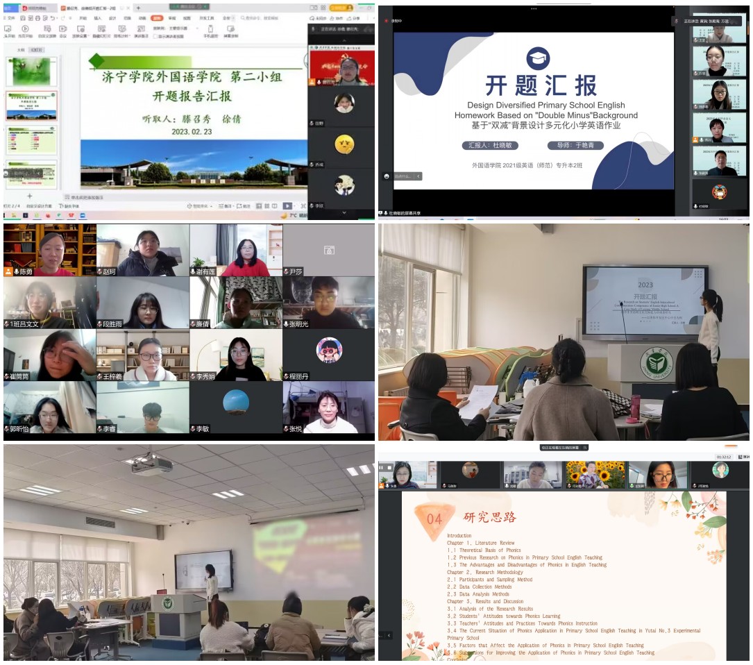 为保证本科毕业论文质量,帮助学生明确研究目标,厘清研究思路,2月20日-24日,外国语学院英语专业、商务英语专业2023届毕业论文开题答辩会以线上线下相结合的方式有序进行。在开题答辩过程中,学生借助PPT,围绕选题背景、研究对象、研究意义、文献综述、研究方法、研究思路、论文结构等方面进行了陈述。答辩教师结合学生的选题,指出研究设计中存在的问题与不足,提出了修改意见,并在会后和学生进行了深入沟通、反馈,进一步完善开题报告。