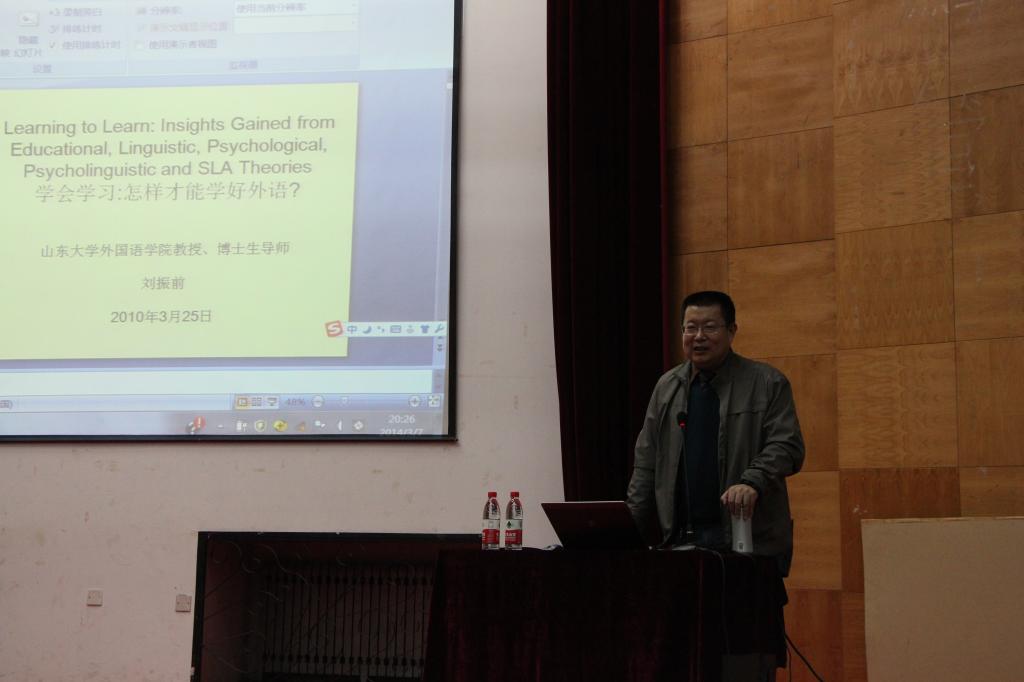 晚上6点半至8点半,刘教授又在我校理科楼报告厅为全系师生做了题为Learning to learn 的学术报告。报告会由外国语系主任杨楠教授主持。刘教授的报告主要分为以下几个方面:学习外语的前景;文学,语言学,翻译三者与外语学习之间的关系以及如何学习文学,语言学及翻译;如何培养听力与口语表达能力;如何提高阅读与写作能力等。刘教授首先从自己学习英语的经历谈起,以语言学、心理语言学和社会语言学的理论框架为基础,深入浅出地讲解了英语学习策略和学习方法。讲座之后,刘教授针对同学们的提问做了耐心而又精彩的回答,针对部分大学生学习中存在的疑惑,刘教授多方位地给出了可行性建议。报告会极大地激发了同学们学好英语的内在动机和追求成为英语人才而不是单纯的英语学习者的愿望,为同学们如何提升综合人文素质如何提高英语水平指明了奋斗的方向。
