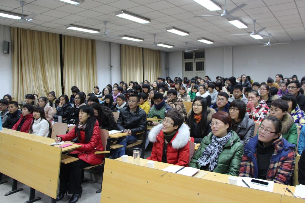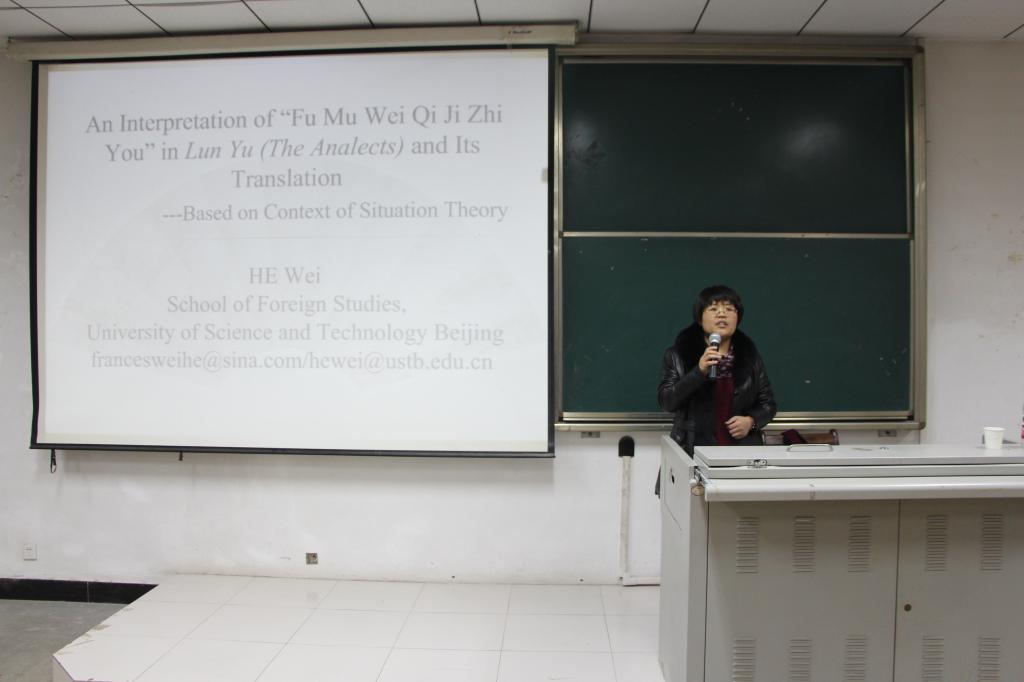 201412107点至9点,北京科技大学外国语学院副院长、博士生导师何伟教授应外国语系邀请,在外语楼C201为全校师生做了题为《论语》疑难章句翻译研究的学术报告。讲座由外国语系主任杨楠主持。