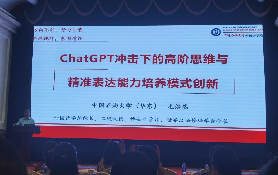 接下来,中国石油大学(华东)毛浩然教授作了《ChatGPT冲击下的高阶思维与精准表达能力培养模式创新》。首先, 毛教授指出ChatGPT在不断迭代升级,给大学英语教师带来危机。未来已来,不可不睬,应该倡导批判性利用ChatGPT。然后,毛教授给大学英语教师提出建议,应突破酋长困境和个人认知天花板,培养高阶思维和精准表达能力。毛教授指出创新高阶思维和精准表述的培养模式包括以下几个方面:从思维能力到高阶思维能力,从表达能力到精准表达能力;从共情能力到家国情怀担当;从问题解决能力到复杂问题解决能力。毛教授语言犀利,幽默,给参会教师留下深刻印象。