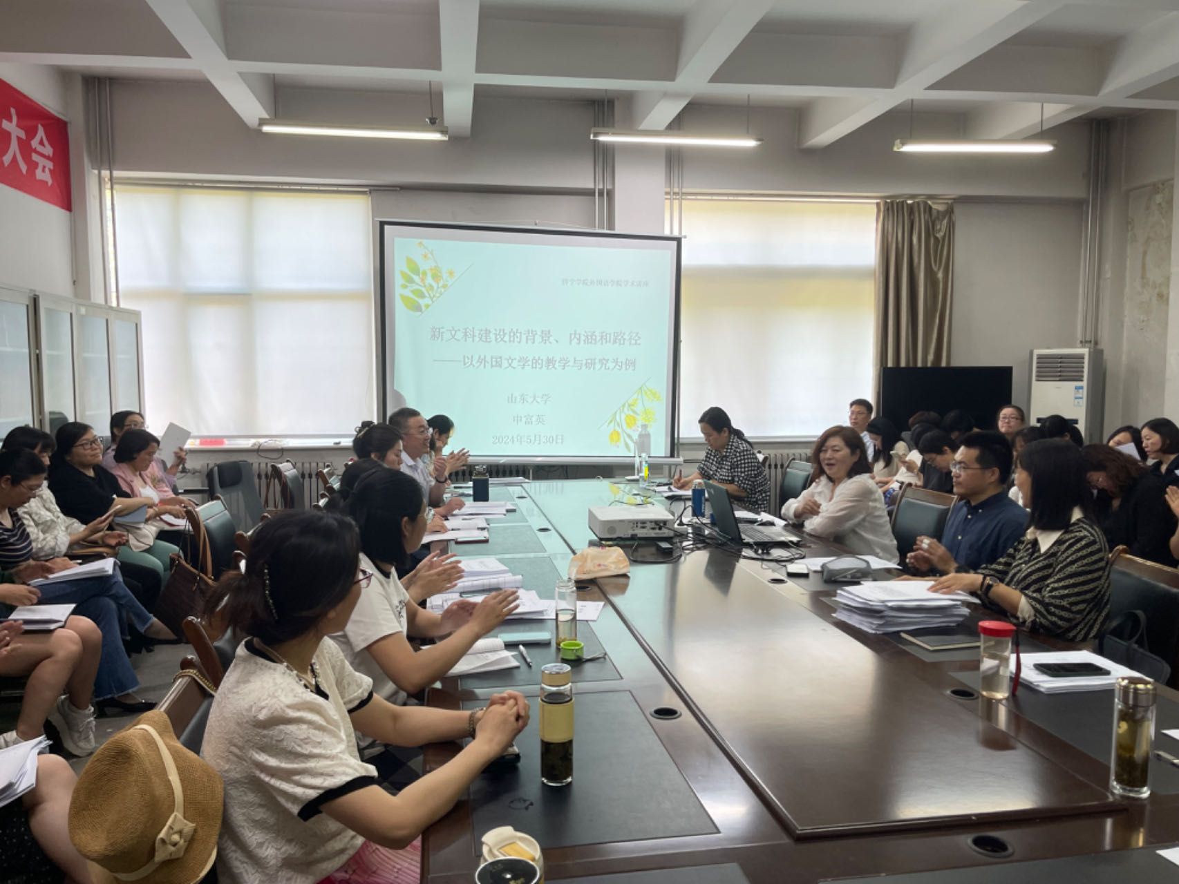 随后,申富英教授与我院老师们就教材的意识形态建构、课程设置、课堂教学改革、学术研究的实践性等问题进行了深入交流。范莉进行了总结,她认为申富英教授的讲座高屋建瓴,在梳理新文科建设核心理念的基础上对外国文学专业存续问题的分析切中肯綮,不但为新时代中国外国文学的教学与研究的创新性发展带来新的思考和启发,同时也为正处于转型中的外国语学院提供了宝贵的指引。