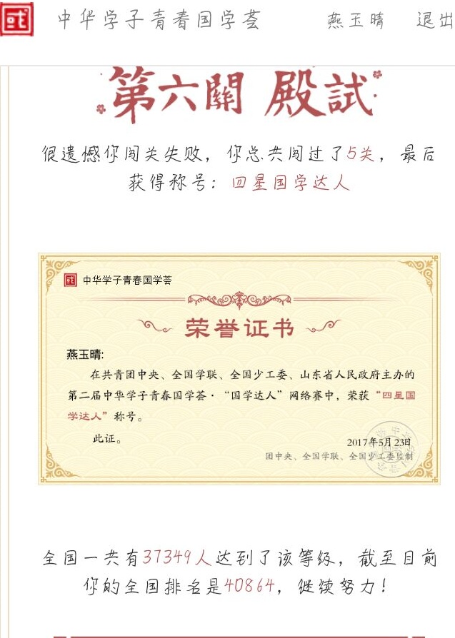 激扬盛夏,报喜连连。在第二届中华学子青春国学荟·“国学达人”网络赛中,2016级跨境电子商务一班的燕雨晴同学,荣获“四星国学达人”的称号。据悉,我校仅有30名学生获此殊荣,说明我系学生也有良好的国学知识功底。希望全系学生向燕雨晴同学学习,在学好自己专业的同时,加强对传统文化知识的学习,不断提高自身的国学知识素养!