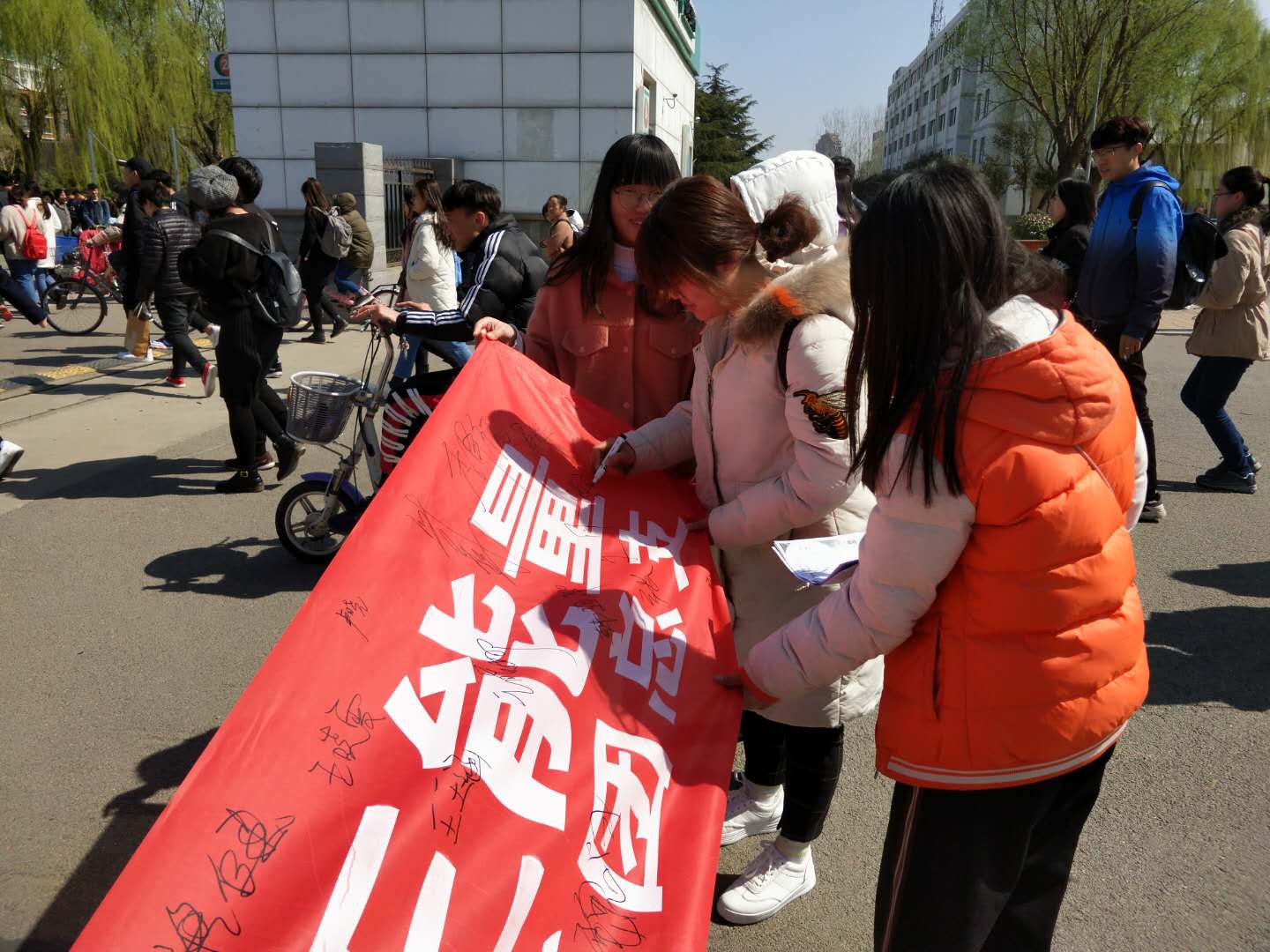 活动中,志愿者们早早集合到学校北门搬桌椅、搭帐篷、挂条幅。随后,志愿者积极引导过往的学生在条幅上签字,并向路过的学生发放弘扬雷锋精神的宣传页。下课的人流熙熙攘攘,但丝毫没有影响到同学们的热情,同学们踊跃参与签名。到中午,条幅上已经签满了密密麻麻的名字。