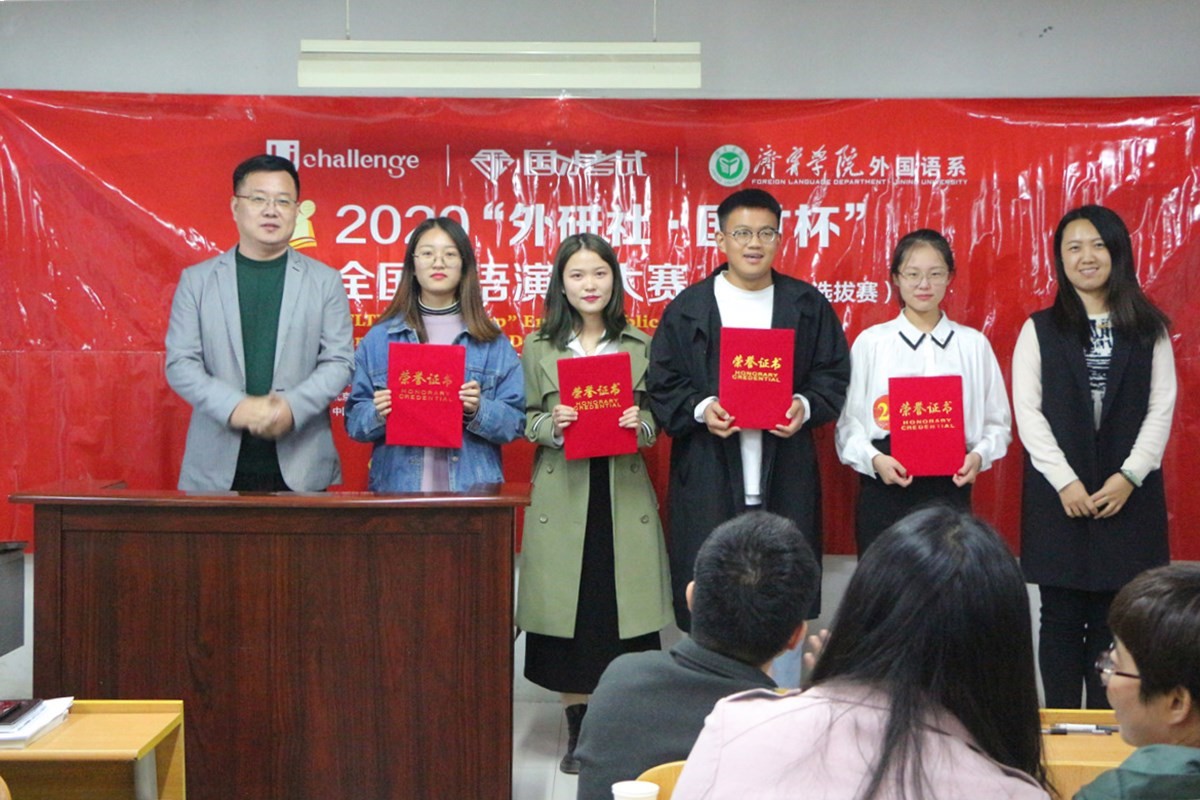 2020年10月19日晚,外国语系在3号楼A217教室成功举办了2020年“外研社•国才杯”演讲比赛济宁学院选拔赛决赛。外国语系党总支副书记许言强,副主任张颖出席本次比赛,李霄露、范莉、栾珍、杨永兵、肖冠华、仇丽丽、王倩倩7位老师担任本次比赛评委。