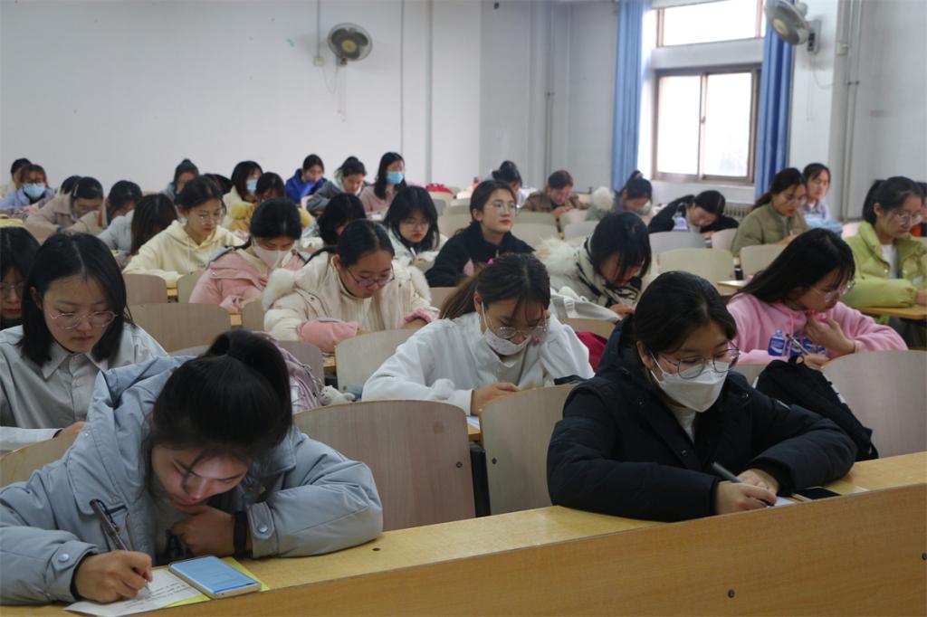 钢笔字组选手分成两组分别在两个教室里进行书写,结束后将作品上交,由评委评分。同学们沉着运笔、一丝不苟,作品笔画流畅、结构匀称、整齐美观,展现了师范专业规范的书写技术。