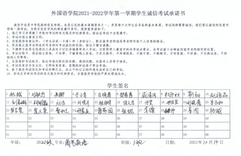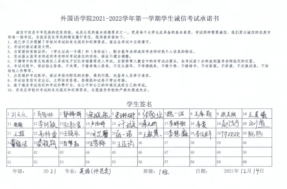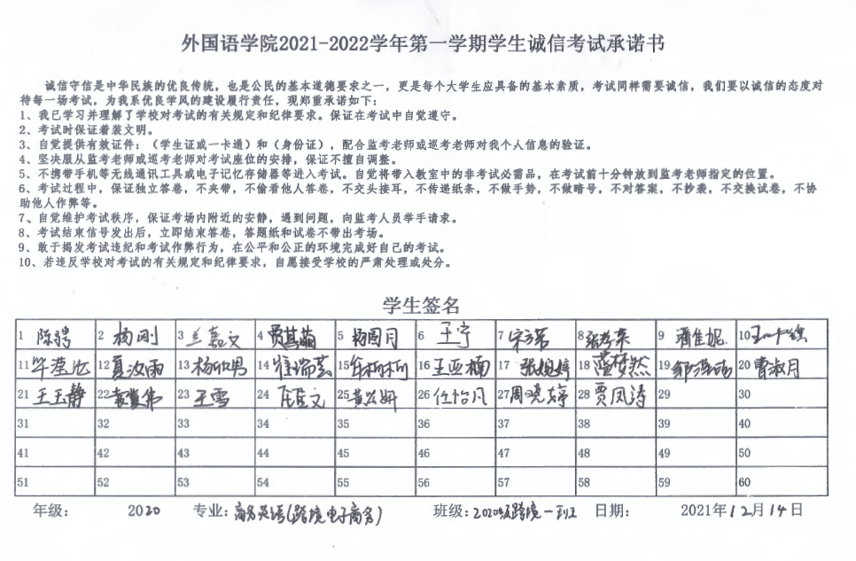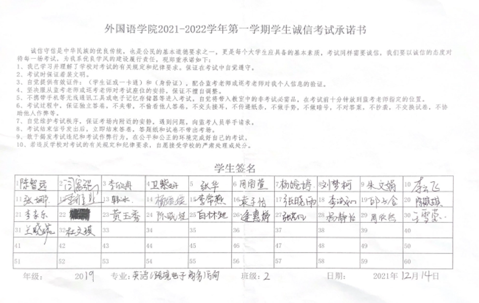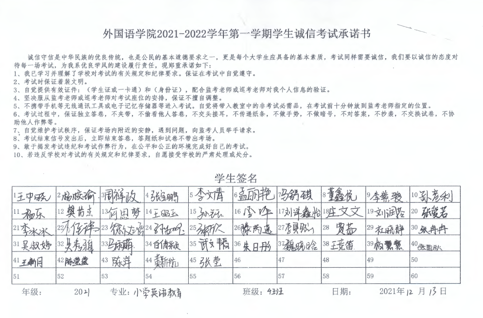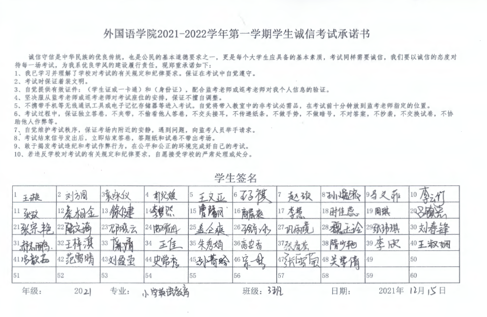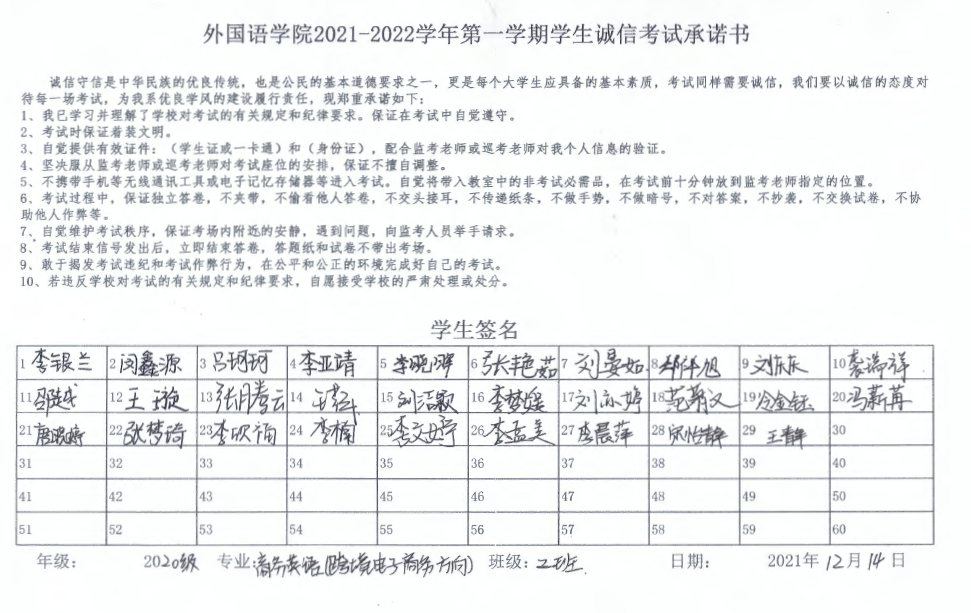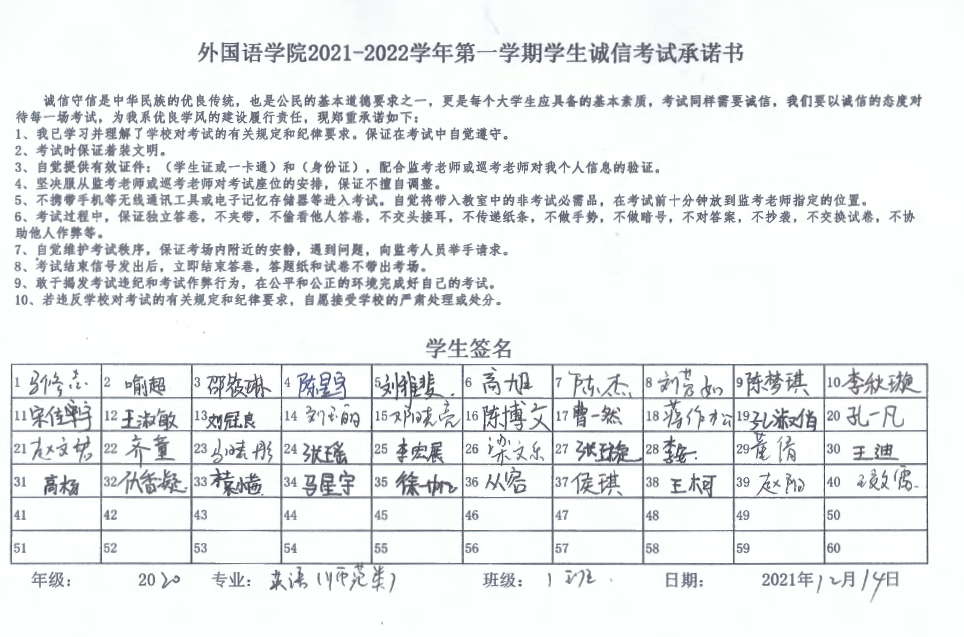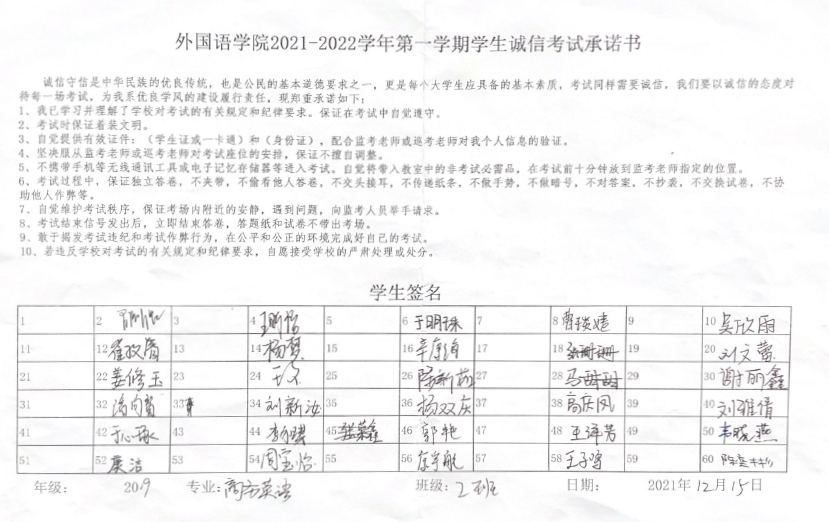 全体同学认真学习考试纪律要求并签订了《外国语学院2021-2022学年第一学期学生诚信考试承诺书》。辅导员向同学们列举了因考试作弊给予纪律处分的典型案例。随后,督促全体学生认真对待宿舍卫生安全,重视疫情防控,通报了学校公寓出现的安全情况,优秀宿舍及未达标宿舍名单,结合案例,向学生们强调了宿舍规章制度的重要性,严禁学生在宿舍使用违规电器,提醒学生们寒假将至,目前疫情情况仍旧非常严峻,放假回家以及假期要注意防护。