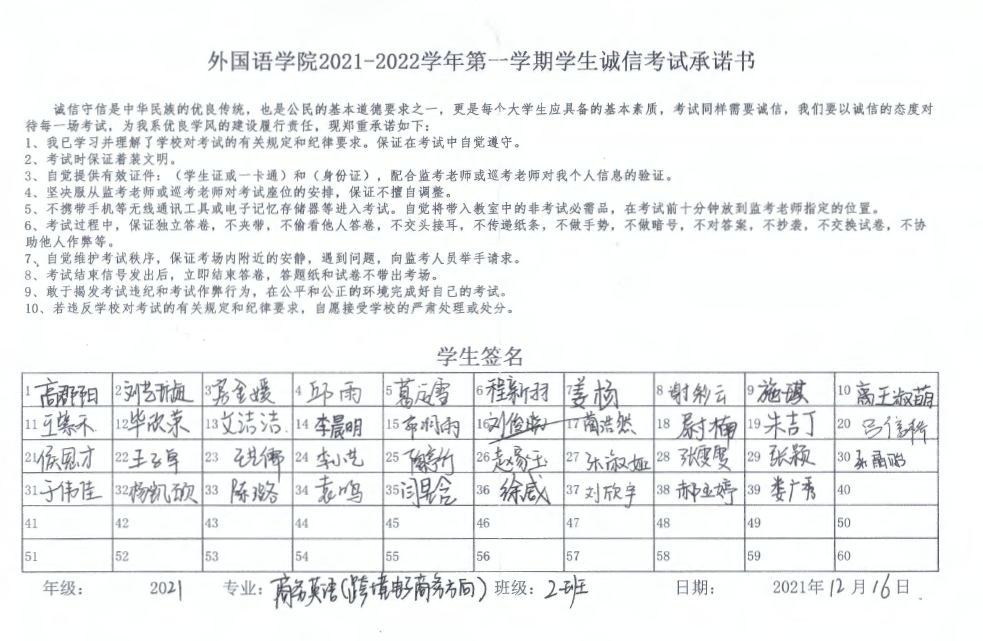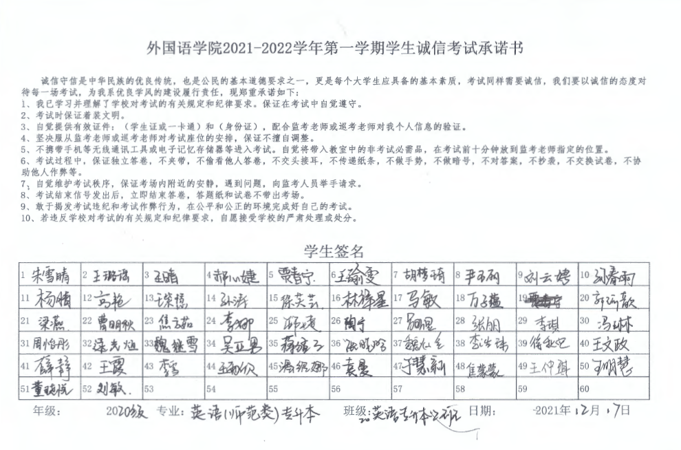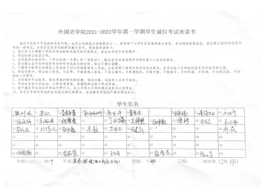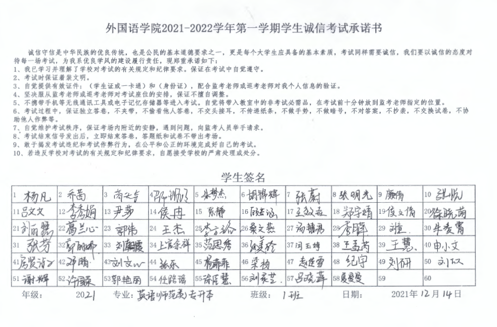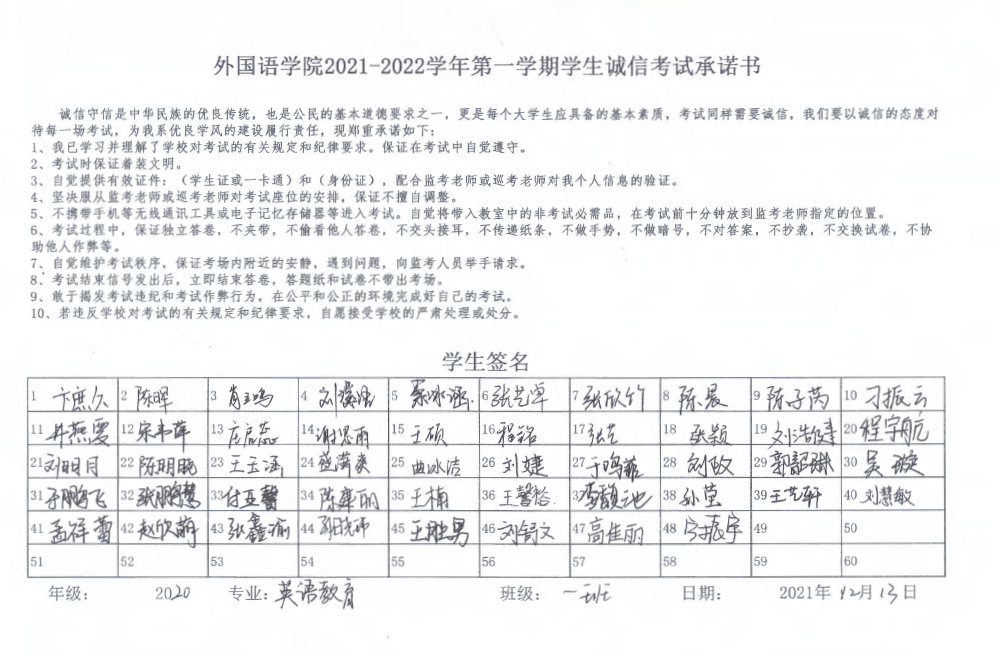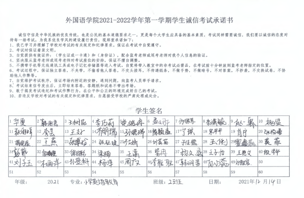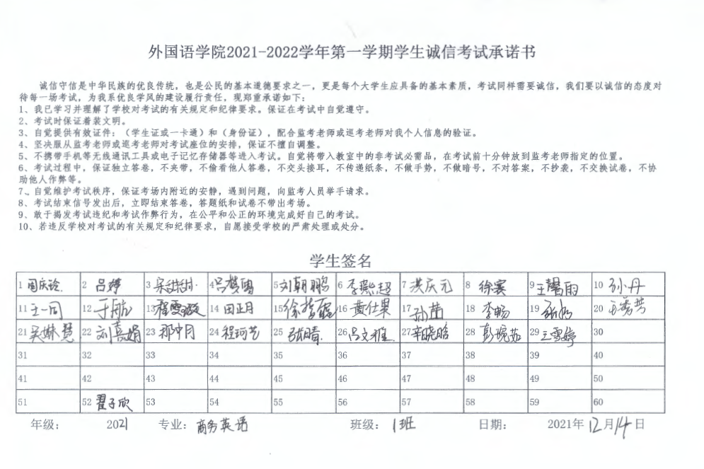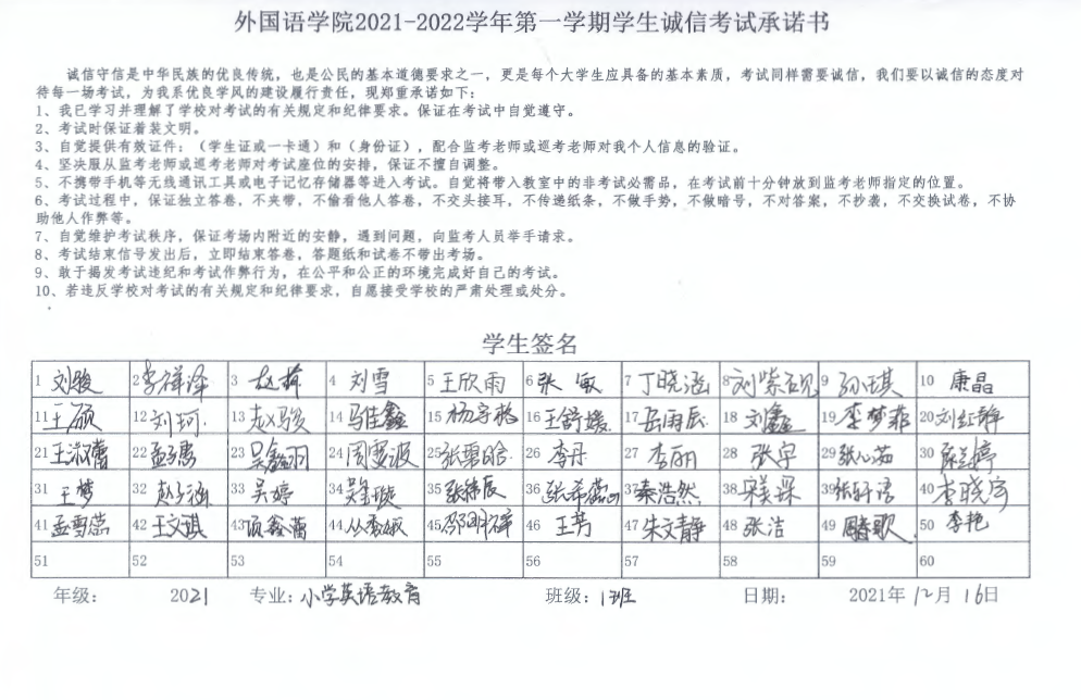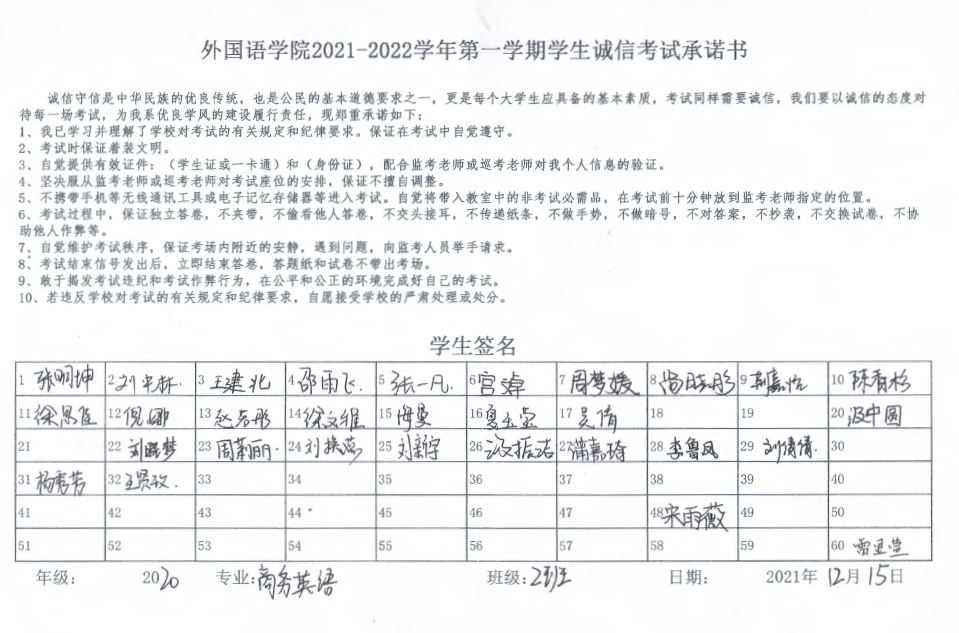 全体同学认真学习考试纪律要求并签订了《外国语学院2021-2022学年第一学期学生诚信考试承诺书》。辅导员向同学们列举了因考试作弊给予纪律处分的典型案例。随后,督促全体学生认真对待宿舍卫生安全,重视疫情防控,通报了学校公寓出现的安全情况,优秀宿舍及未达标宿舍名单,结合案例,向学生们强调了宿舍规章制度的重要性,严禁学生在宿舍使用违规电器,提醒学生们寒假将至,目前疫情情况仍旧非常严峻,放假回家以及假期要注意防护。