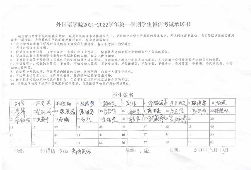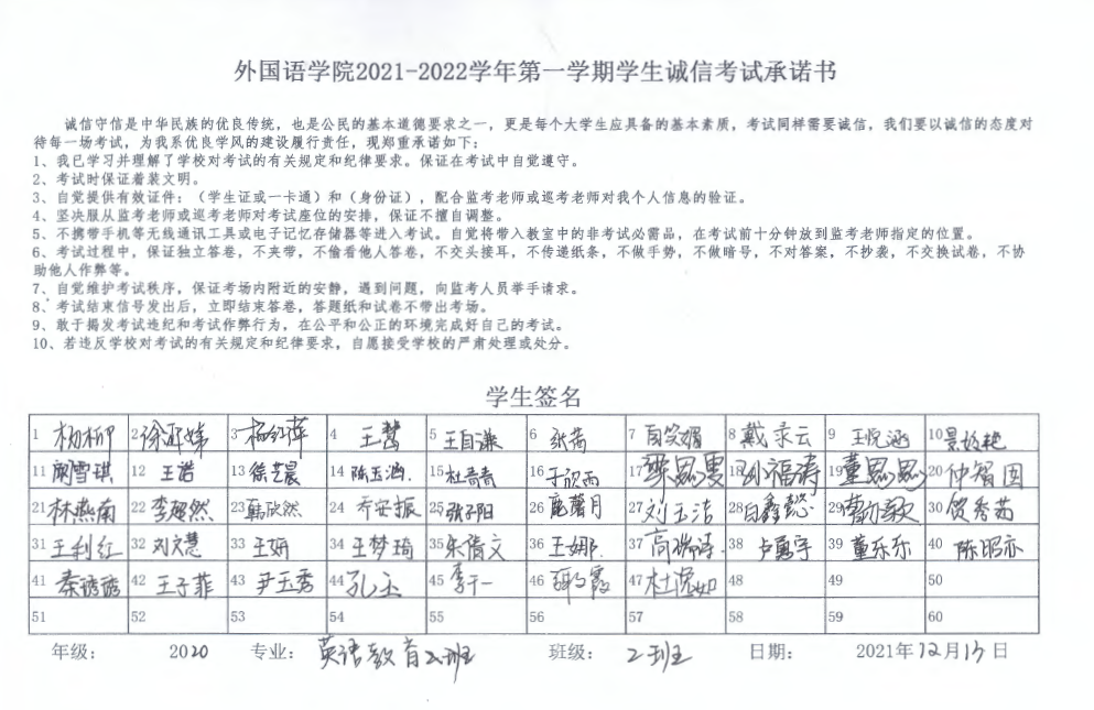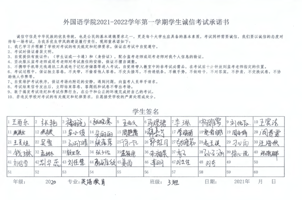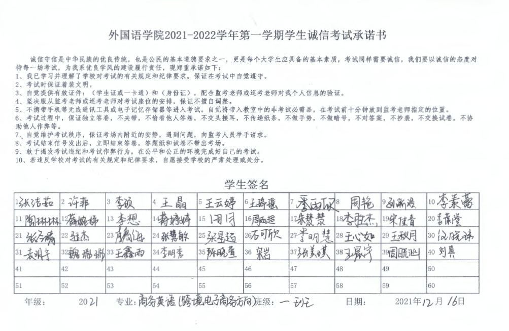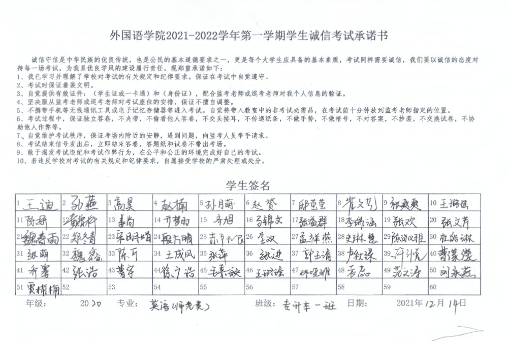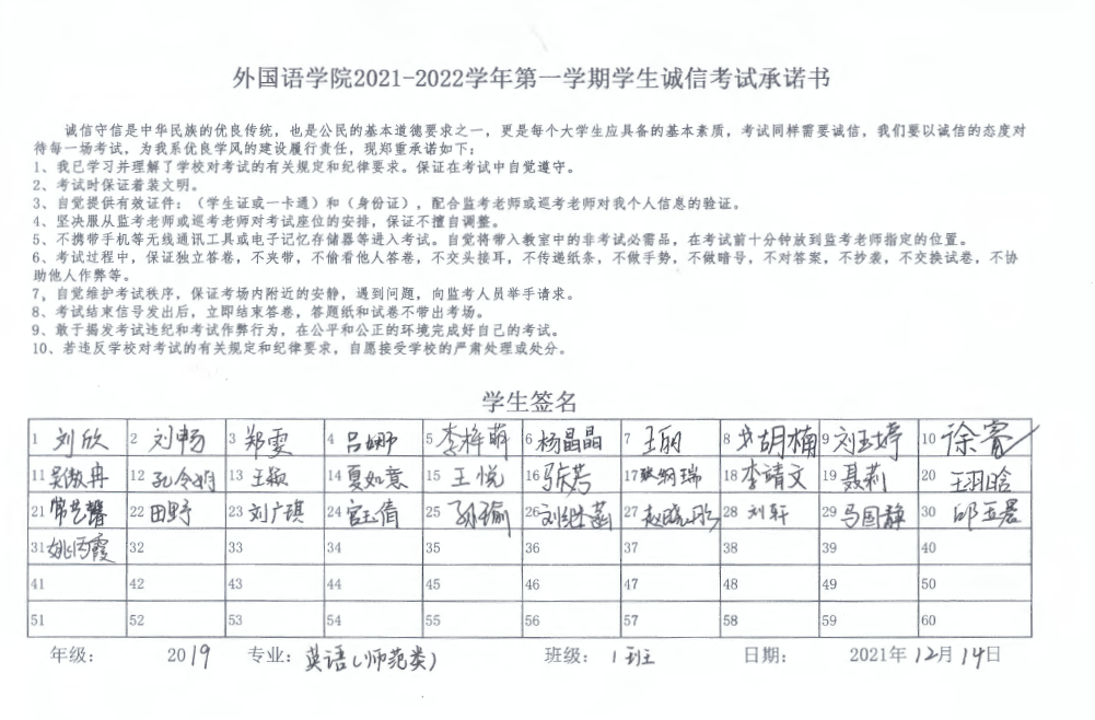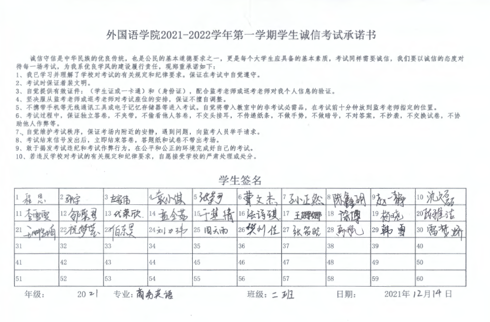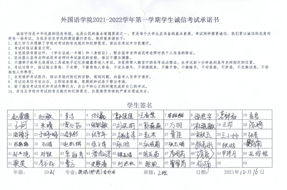 全体同学认真学习考试纪律要求并签订了《外国语学院2021-2022学年第一学期学生诚信考试承诺书》。辅导员向同学们列举了因考试作弊给予纪律处分的典型案例。随后,督促全体学生认真对待宿舍卫生安全,重视疫情防控,通报了学校公寓出现的安全情况,优秀宿舍及未达标宿舍名单,结合案例,向学生们强调了宿舍规章制度的重要性,严禁学生在宿舍使用违规电器,提醒学生们寒假将至,目前疫情情况仍旧非常严峻,放假回家以及假期要注意防护。