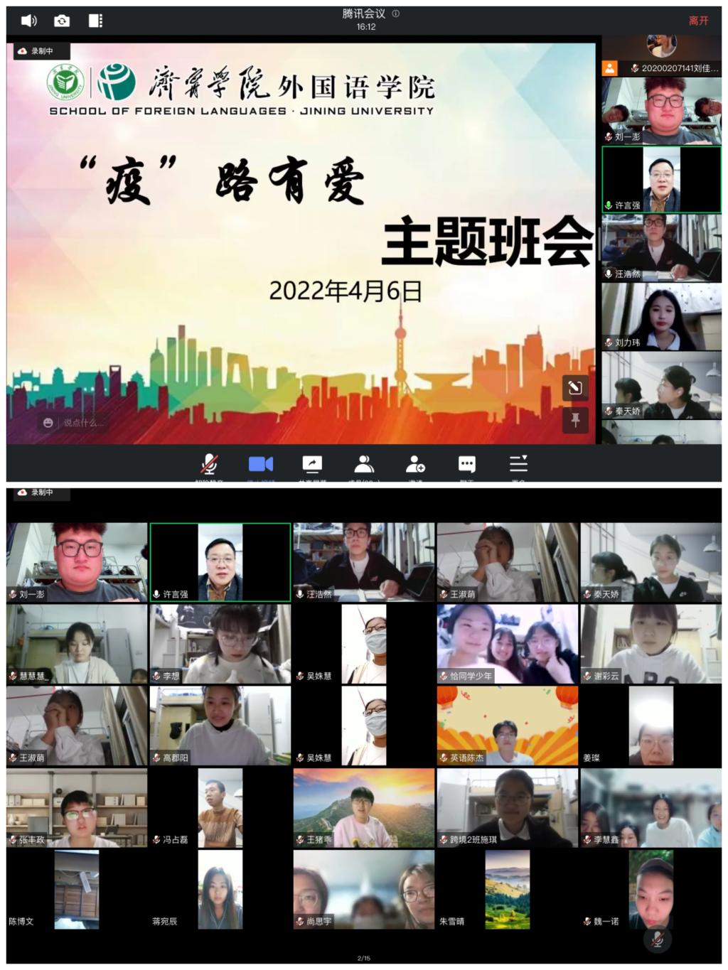 疫情无情,“疫”路有爱。“云班会”拉近了老师和同学间的距离,给同学们送去了一缕暖阳。外国语学院一条心,一股劲,一盘棋共抗疫情,也将用关心、暖心、爱心洒满校园,为学生保驾护航。愿破晓的曙光驱散阴霾,愿短暂的冷清换来久安,让我们共同期待“疫”消云散。
