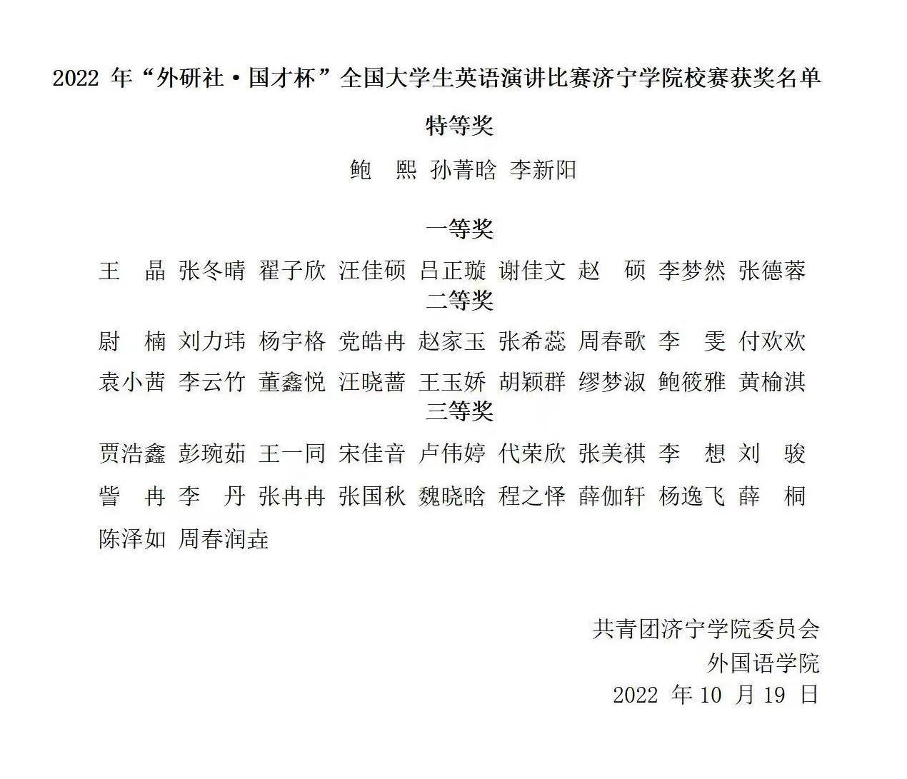 选手们围绕大赛主题“China’s wisdom for the world”(构建人类命运共同体:中国向世界贡献的智慧),用英文讲好中国故事,传播中国声音,从不同视角分享了对 “理解中国、沟通世界”的思考,展现了济宁学院学子的良好风采和文化底蕴。经过激烈角逐,鲍熙、孙菁晗、李新阳3位同学同学凭借出色的表现和稳定的发挥,荣获特等奖;王晶等9位同学荣获一等奖;尉楠等18位同学荣获二等奖;贾浩鑫等20名同学荣获三等奖。