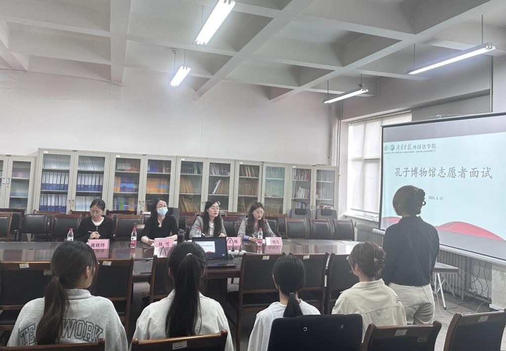 4月11日,外国语学院在一楼会议室组织了志愿者的面试选拔。面试评委团由外国语学院党委副书记文灿、挂职锻炼教师刘义翠、辅导员段明月,以及孔子博物馆社会教育部副主任王桂美和志愿服务管理负责人林雪老师组成。此次面试选拔经过严格的初步筛选,最终有百余名学生脱颖而出,进入到了面试环节。