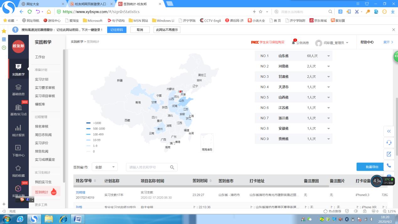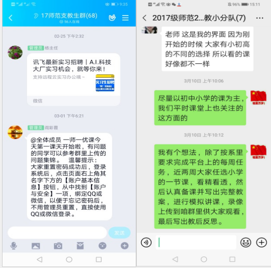 全体指导老师认真落实线上学习相关文件要求,严格执行线上实习方案,利用“校友邦”实习软件的签到、周记批改等功能,督促学生每天按时签到,上传周记、学习心得,定期完成实习教案。师范实习生在山东教师教育网“一师一优课”平台和指导老师推荐的其它实习资源网站进行在线观评课等实践活动。师生共用腾讯会议、腾讯课堂、“一师一优课工作坊”、qq群和微信群等网络平台进行在线实习指导交流。