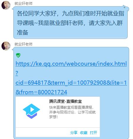 系指导老师和企业职业导师通过腾讯课堂、微信等形式,针对每个学生不同岗位意向,进行耐心细致的个性化指导,分享各类远程面试案例素材,提醒学生远程面试中的注意事项,对求职过程中出现的问题及时答疑解惑,为同学们防疫期间线上求职增加信心。