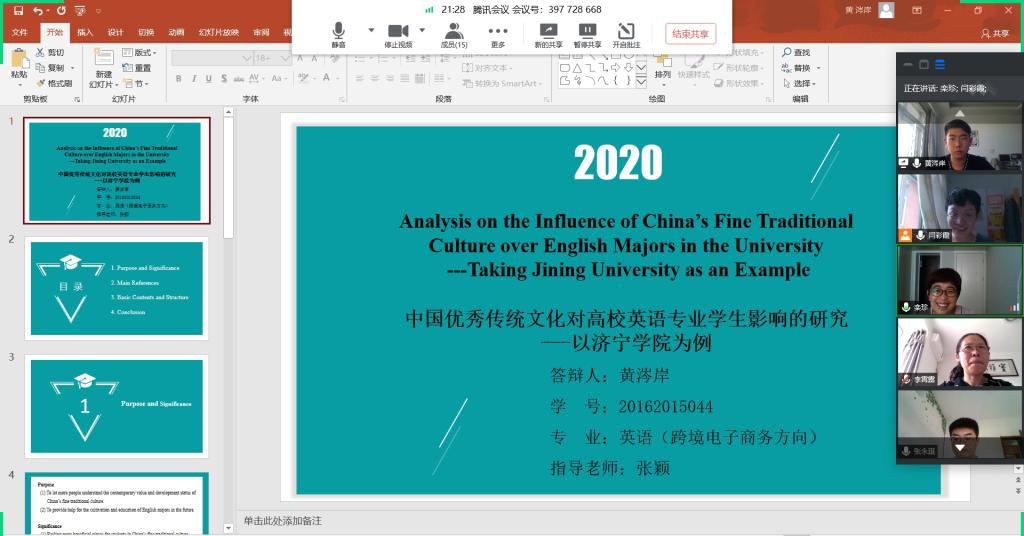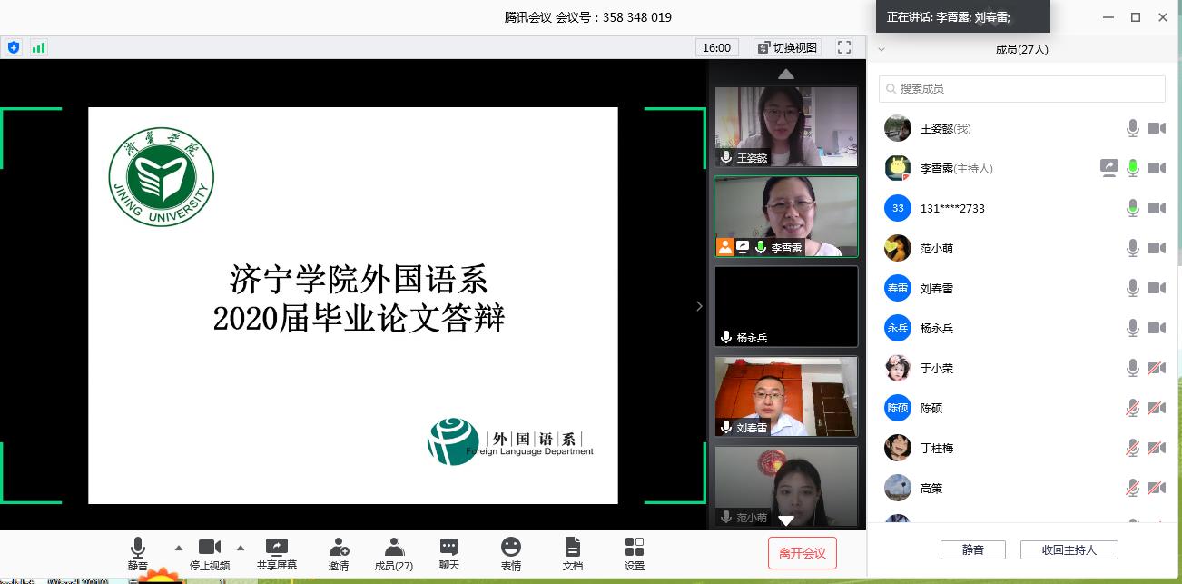 为落实好学校2020届本科生毕业设计(论文)答辩工作部署,确保毕业生能够如期毕业,5月22-25日,外国语系举行2020届英语专业本科毕业生论文线上答辩。此次答辩通过“腾讯会议”平台分13组进行,共有228名学生和29位老师参加。外国语系精心谋划,细致安排,全系上下齐心协力,紧密配合,圆满完成了预期任务。