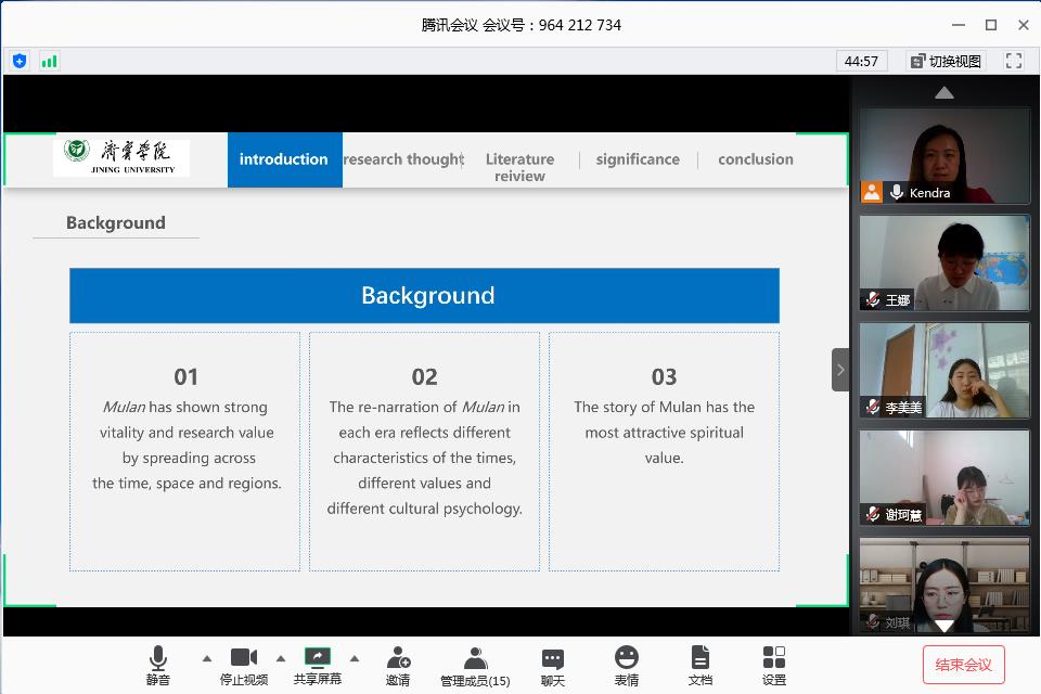 文学博士范莉老师坦言,外国语系今年第一次“云答辩”进行的有条不紊,经过前期与指导教师的反复讨论和修改,学生论文的研究内容、结构、语言等更严谨,疫情期间,不能返校,学生得以有更多的时间去沉淀和思考。通过论文写作,学生们具备了初步的科研能力,通过线上答辩,学生们练习了规范的学术表达,同时,在把控时间、精炼语言和逻辑思维等方面也得到了锻炼。毕业,并不意味着结束,而代表着新的人生阶段的开启,希望同学们能不忘初心,以自己喜欢的方式过最有意义的人生。