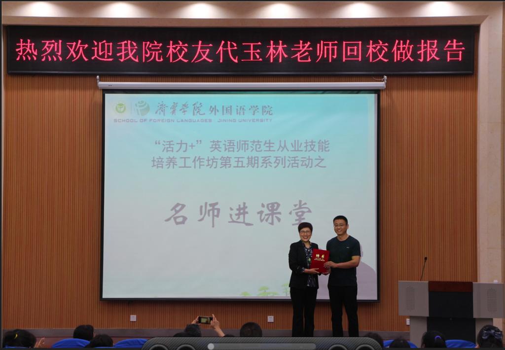 工作坊开始,杨楠院长为代玉林老师颁发聘书,感谢代玉林老师心系母校、回馈母校;杨楠院长也表达了对在校英语师范生的殷切期望,希望同学们不断提升自身的教师技能水平,心怀爱的种子,从事自己热爱的教育,让爱的教育创造成长奇迹。