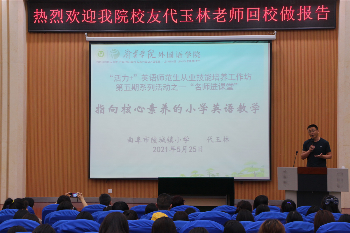 为顺应国家教育改革发展潮流,全面体现英语学科的育人价值,迎接师范专业认证,5月25日晚7:00-9:00,外国语学院成功举办“活力+”英语师范生从业技能培养工作坊第五期系列活动之---“名师进课堂”。外国语学院英语师范生从业技能培养工作坊已连续成功举办四期,本次工作坊是第五期系列活动之一“名师进课堂”,邀请中小学一级教师代玉林老师为赢博足球师范生作了题为“指向核心素养的小学英语教学”的报告。外国语学院院长杨楠教授、英语师范生教师教育导师团和370多名英语师范生共同参加了此次活动。活动由外国语学院副院长张颖主持。