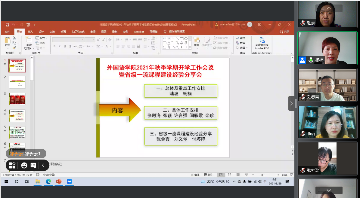 8月28日上午,外国语学院线上2021年秋季学期开学工作会议暨省级一流课程经验分享会顺利举行,外院全体教职工参加会议。会议由外国语学院院长杨楠教授主持。