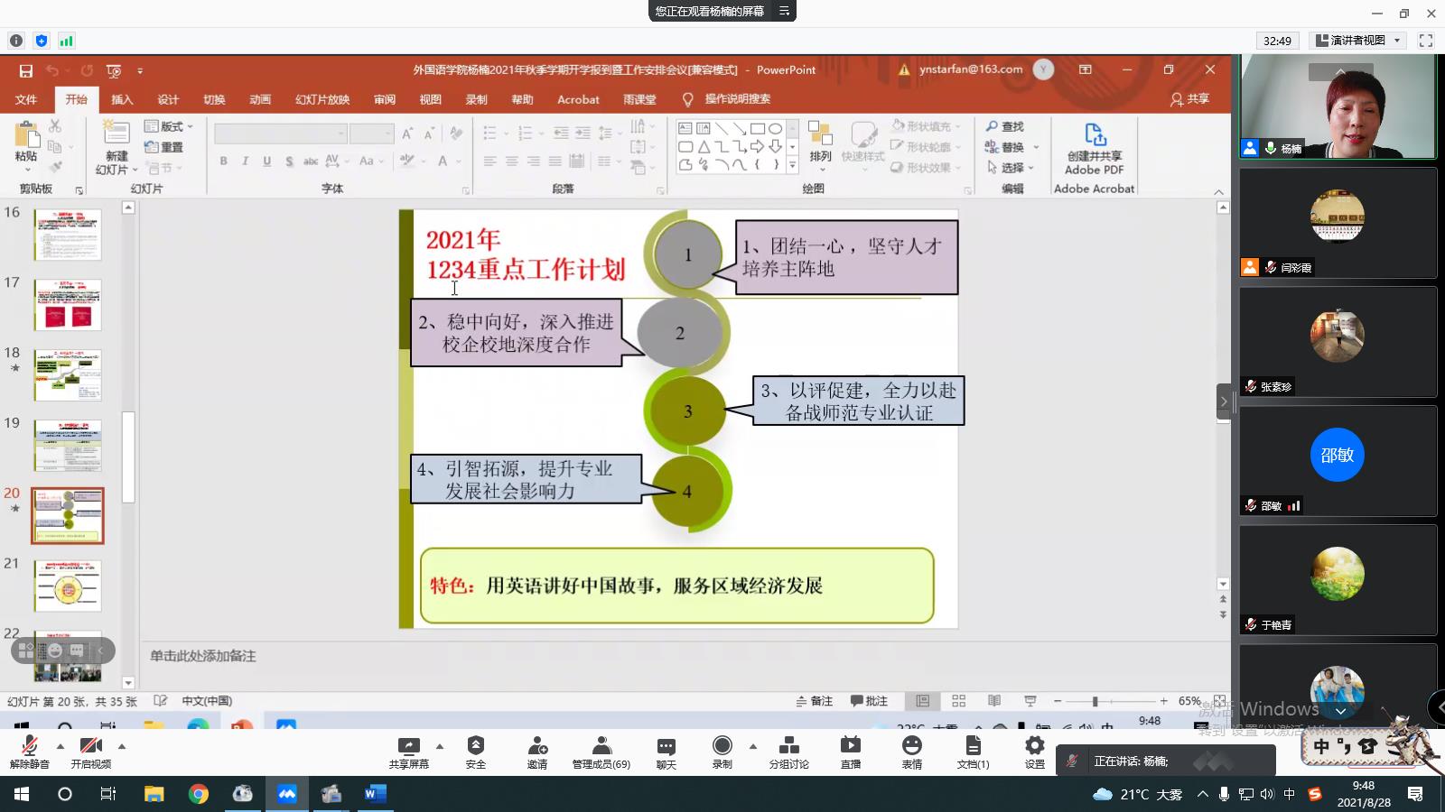 杨楠以学习习近平总书记“七一”重要讲话精神心得为纲,以外院40年专业发展路线为径,以近5年毕业生就业和专业满意度问卷调查、近5年外院教师教学科研基本情况问卷调查为据,以《普通高等学校本科专业类教学质量国家标准》、《普通高等学校本科外国语言文学类专业教学指南》为要,回顾了外院在人才培养、服务社会、教学、科研、社会美誉度、毕业生满意度等方面取得的成绩,分析了目前发展面临的困难和机遇,安排了2021年秋季学期将重点推进的1234工作计划。1是要团结一心,坚守为谁培养人、培养什么人、怎样培养人的人才培养主阵地,做到常规教学6大坚持;2是要稳中向好,深入推进校企校地深度合作;3是要以评促建,全力以赴做好师范专业认证准备工作;4是要引智拓源,提升专业发展社会影响力。