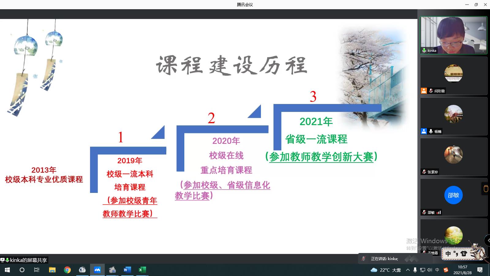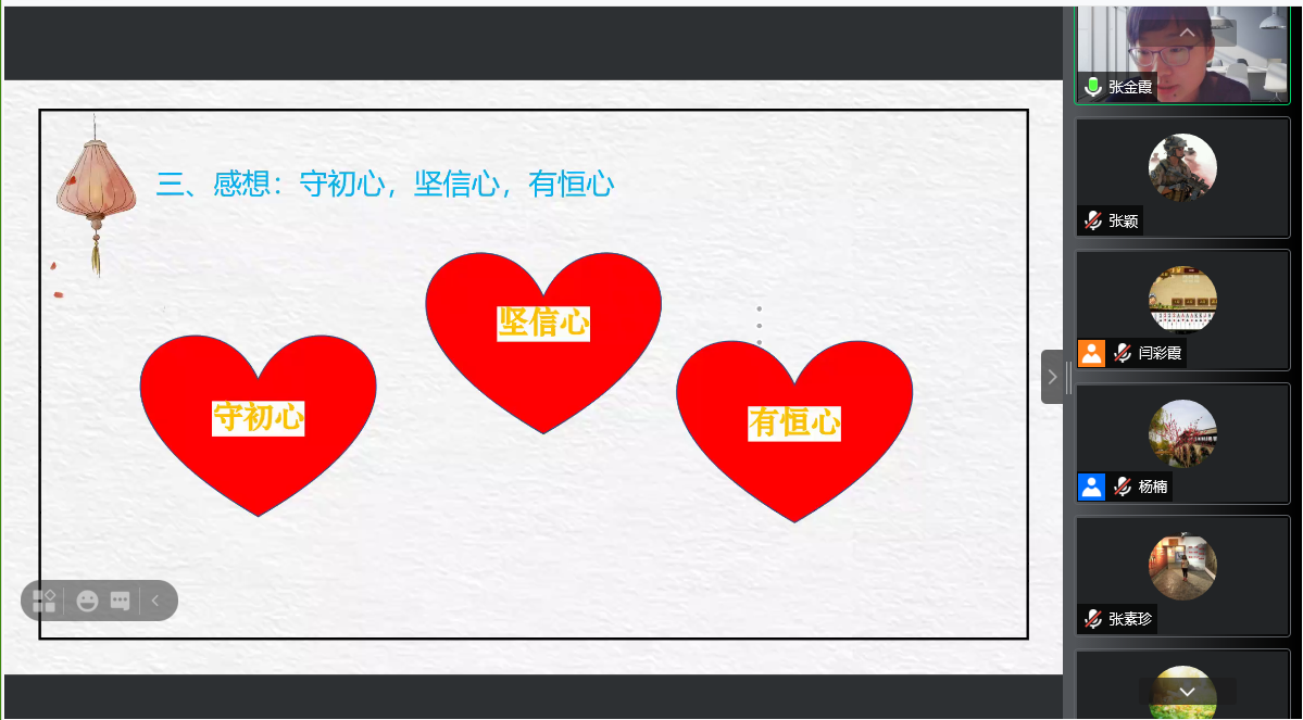 省级一流课程经验分享阶段,张金霞老师团队无私分享了建设省级一流课程的成功经验与心得。张金霞通过精心准备的PPT,从课程建设理念、课程教学设计展示、教学团队分工、线上线下课程考核评价方式、一流课程申报材料撰写细节、说课录课注意事项、课程创新特色、课程建设规划等方面作了全面详细的介绍,让全体老师深刻感受到了一流课程建设要功在平时,用心、用情上好每一节课,守初心,坚信心,有恒心,注重平时教学素材的积累,不断优化教学设计、凝练课程亮点、更新教学理念,就一定能让课程建设得越来越好,让更多学生受益。团队刘义翠老师、付婷婷老师从课程改革、教学评价、发展规划等方面做了补充介绍。老师们针对课程建设进行了热烈的线上讨论。
