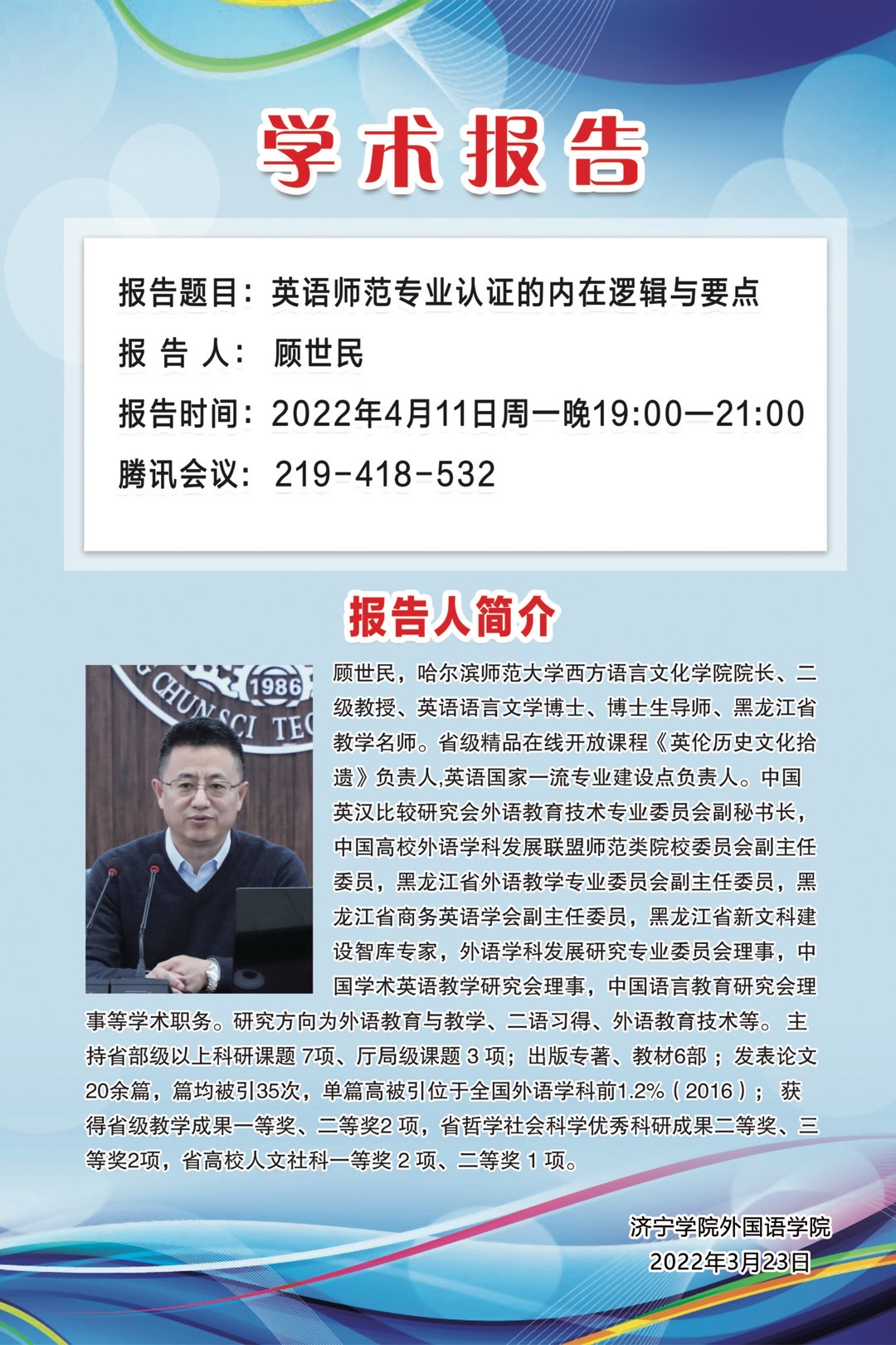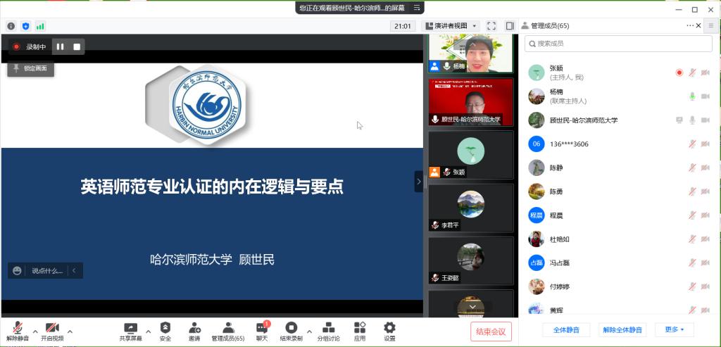 411日晚,哈尔滨师范大学顾世民教授应邀为外国语学院全体教师做了题为“英语师范专业认证的内在逻辑与要点”的线上讲座。本次讲座由外国语学院院长杨楠教授主持,外院全体老师通过腾讯会议参加了讲座。